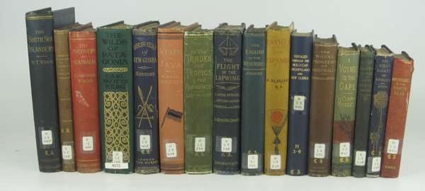 Voyages of the Dutch brig of war, Dourga..., 1840, modern cloth; Blakeney, William The coasts of Cathay and Cipango forty years ago, 1902, original yellow cloth; Melville, Herman Omoo: a narrative of adventures in the South Seas..., 1847, original red cloth; Skottsberg, Carl The wilds of Patagonia..., 1911, original green cloth gilt; Moresby, John Discoveries & surveys in New Guinea..., 1876, original blue cloth gilt; Worsford, W. Basil A visit to Java..., 1893, original salmon cloth gilt; Brassey, Lady In the trades, the tropics, & the roaring forties..., 1887, original green cloth gilt; Shore, Henry Noel The flight of the Lapwing..., 1881, original blue cloth gilt; Osborn, Sherard A cruise in Japanese waters. Edinburgh, 1859, green cloth; all ex-library, Cruising Association gilt stamps and bookplates; and a quantity of others, sold not subject to return (53)