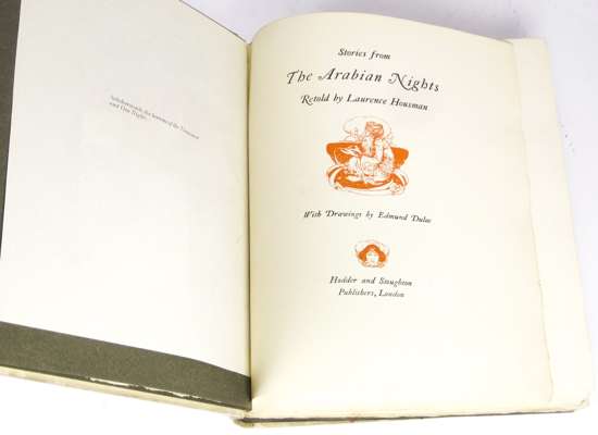 Stories from the Arabian nights. London: Hodder and Stoughton, 1907. 4to, number 288 of 350 copies signed by Edmund Dulac, 50 coloured plates by Dulac, original vellum gilt, pink silk ties