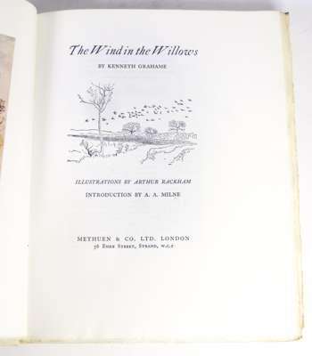 The wind in the willows. London: Methuen & Co. Ltd., [1951]. 4to, number 325 of 500 copies, 12 colour plates by Arthur Rackham, original calf, several pages uncut, bookplate of H.C. Drayton