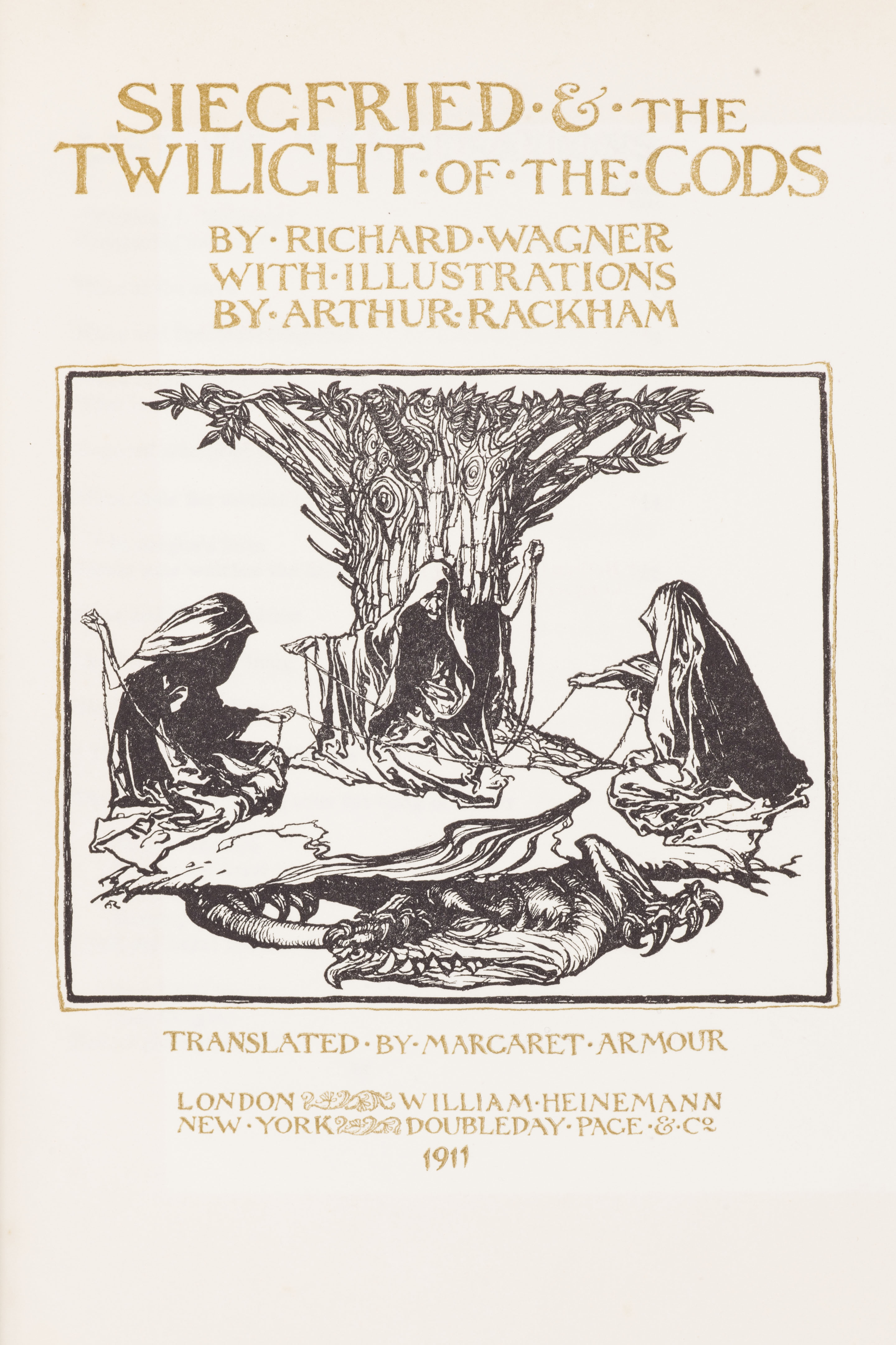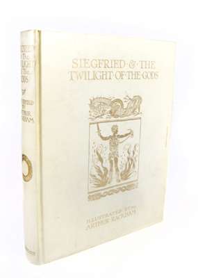 Siegfried & the twilight of the gods. London: William Heinemann/New York: Doubleday, Page & Co., 1911. 4to, number 967 of 1150 copies signed by Arthur Rackham, 30 tipped-in colour plates by Rackham, original vellum gilt, lacking ties
