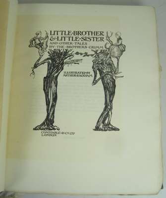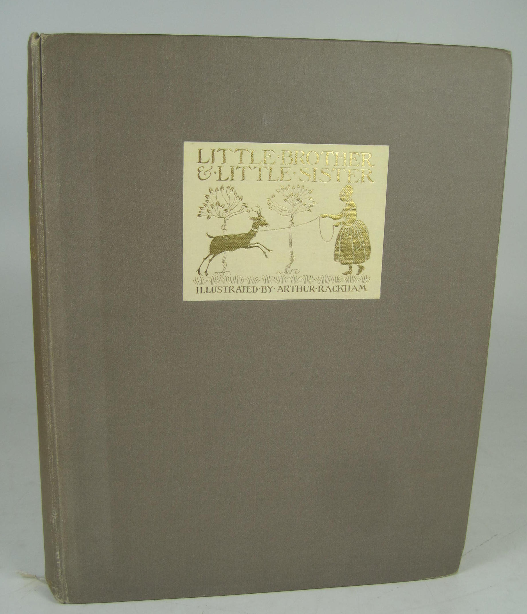 Little brother and little sister. London: Constable & Co., [1917]. First edition, 4to, number 471 of 525 copies signed by Arthur Rackham, 13 coloured mounted plates by Rackham, original grey cloth gilt, spine gilt, pictorial cream gilt label on upper cover, uncut, armorial bookplate to front endpaper and verso of free endpaper, now lacking the additional loose signed plate (see note), upper hinge cracking, very slight discoloration from original plate tissue-guards