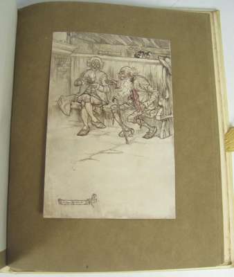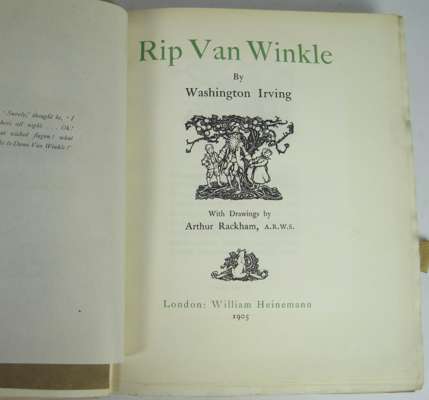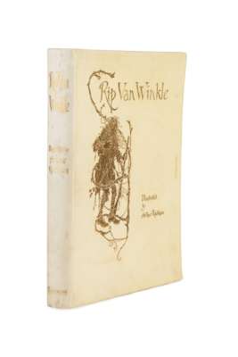 Rip van Winkle. London: William Heinemann, 1905. 4to, number 179 of 250 copies signed by Arthur Rackham, 50 tipped-in colour plates by Rackham (counting double plate 5 as two), original vellum gilt, bookplate of Hamilton of Carnell, upper tie lacking, lower tie detached