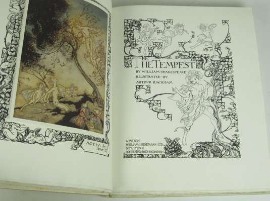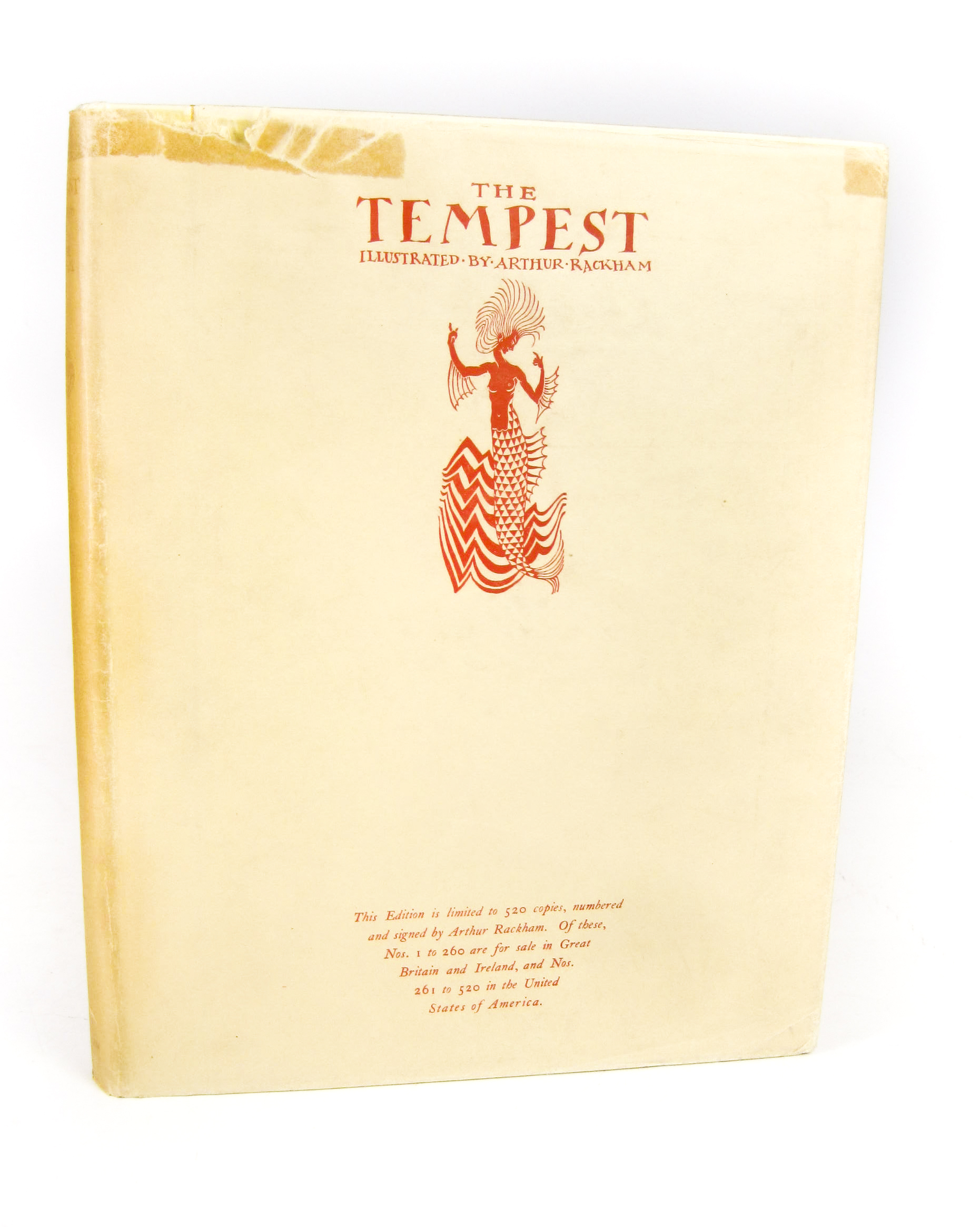 The tempest. London: W. Heinemann, [1926]. First edition, 4to, number 193 of 560 copies signed by the artist, 21 mounted colour plates by Rackham (including the "extra plate" listed in List of Illustrations), original quarter vellum, pictorial cream boards gilt, uncut, dustwrapper repaired at head, slipcase