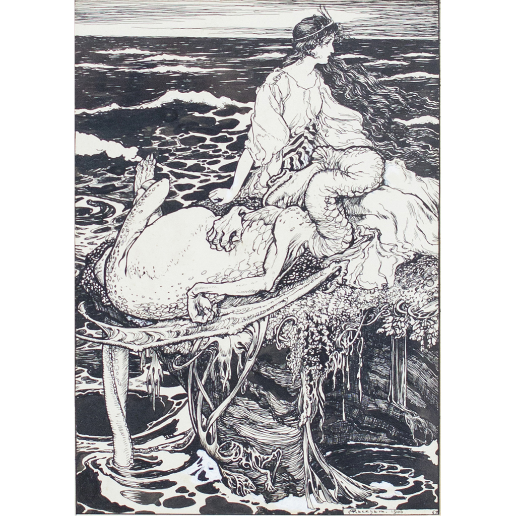 The princess and the dragon, signed, dated 1900 and numbered 67, pen and ink, on paper, 21cm x 15cm