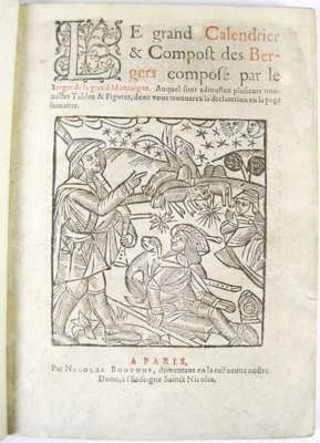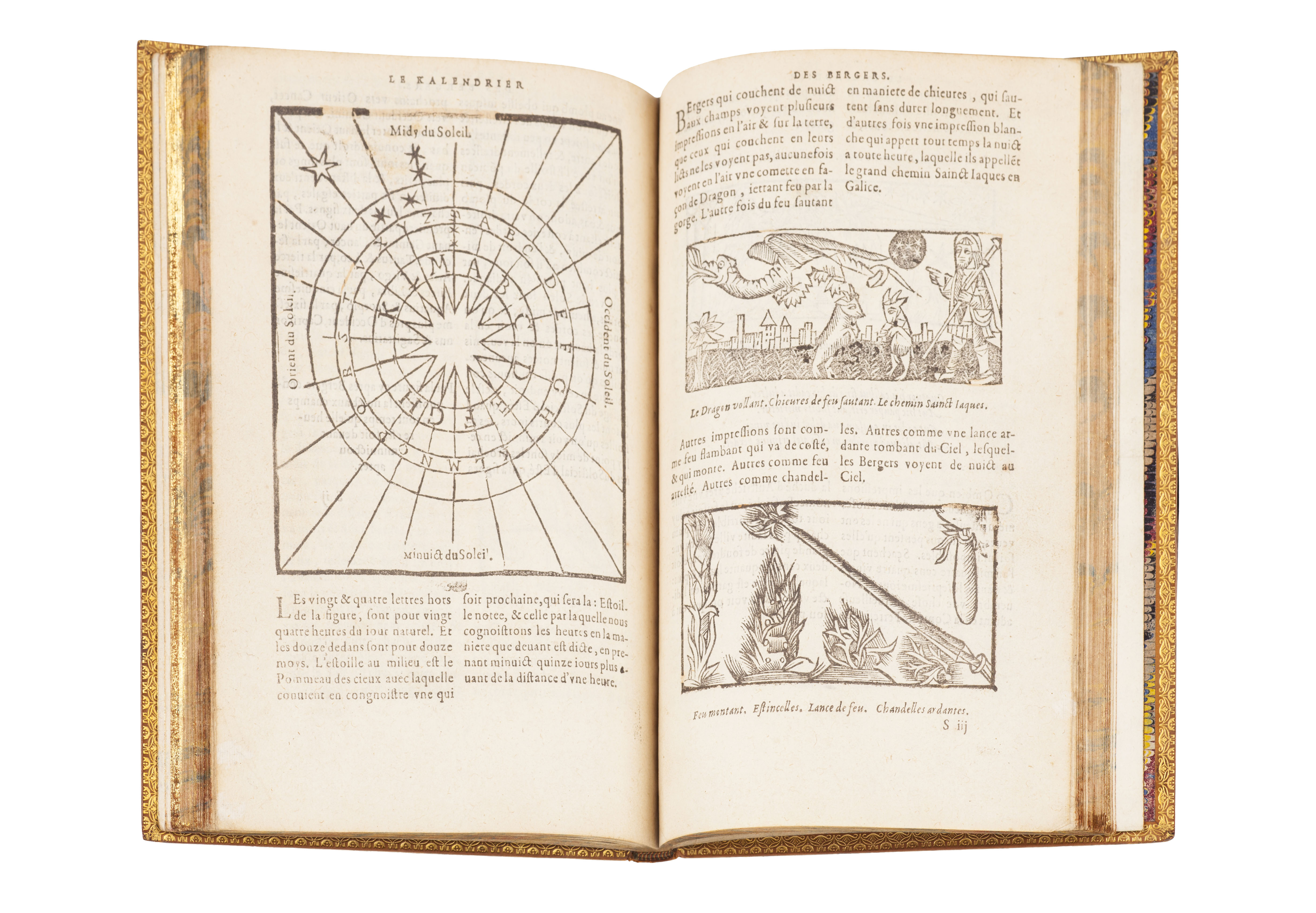 Le grand calendrier & compost des bergers. Paris: Nicholas Bonfons, [c.1589]. 4to, some pages in red and black, woodcut illustrations throughout, nineteenth-century calf gilt by ? E. Niederer, spine gilt in compartments, g.e., repairs to first few leaves, mainly marginal, a little rubbing