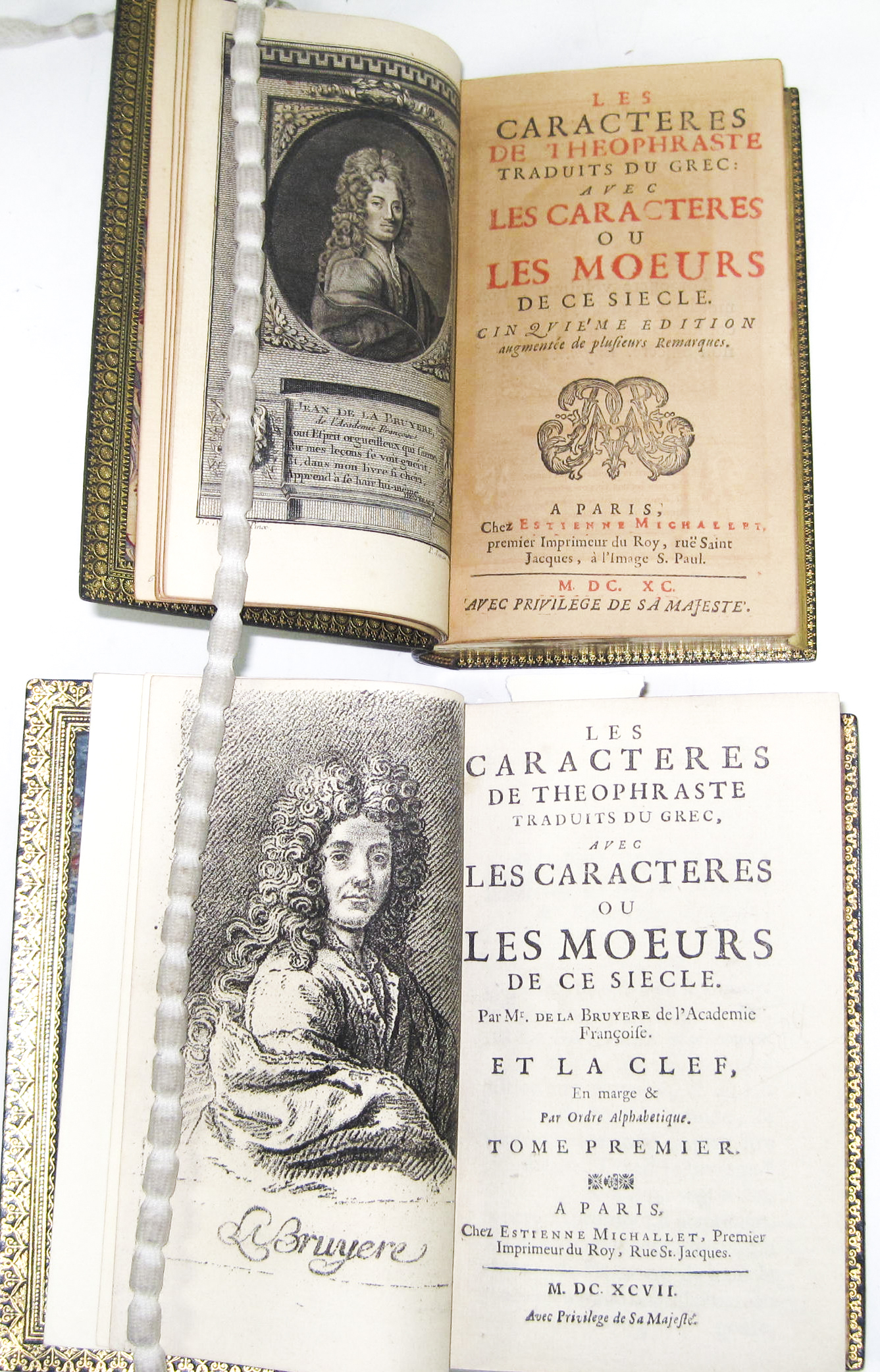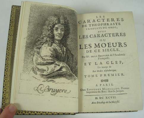 Les caractères de Theophraste. Paris: E. Michallet, 1690. Fifth edition, 12mo, engraved portrait; La Bruyère, Jean de Les caractères de Theophraste. Paris: E. Michallet, 1697, 2 volumes in one, also bound with Suite des caractères de Theophraste. 12mo, engraved portrait, late 19th century fine morocco gilt, g.e. (2)