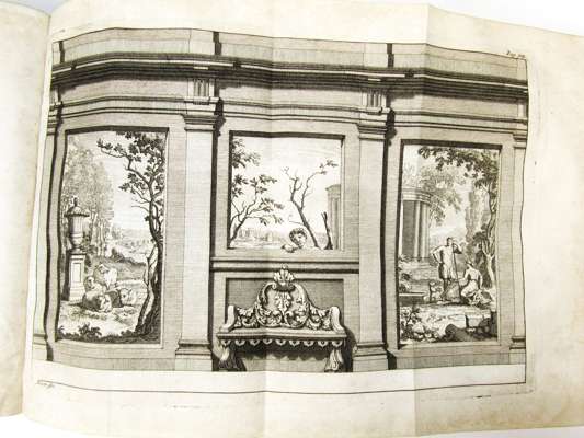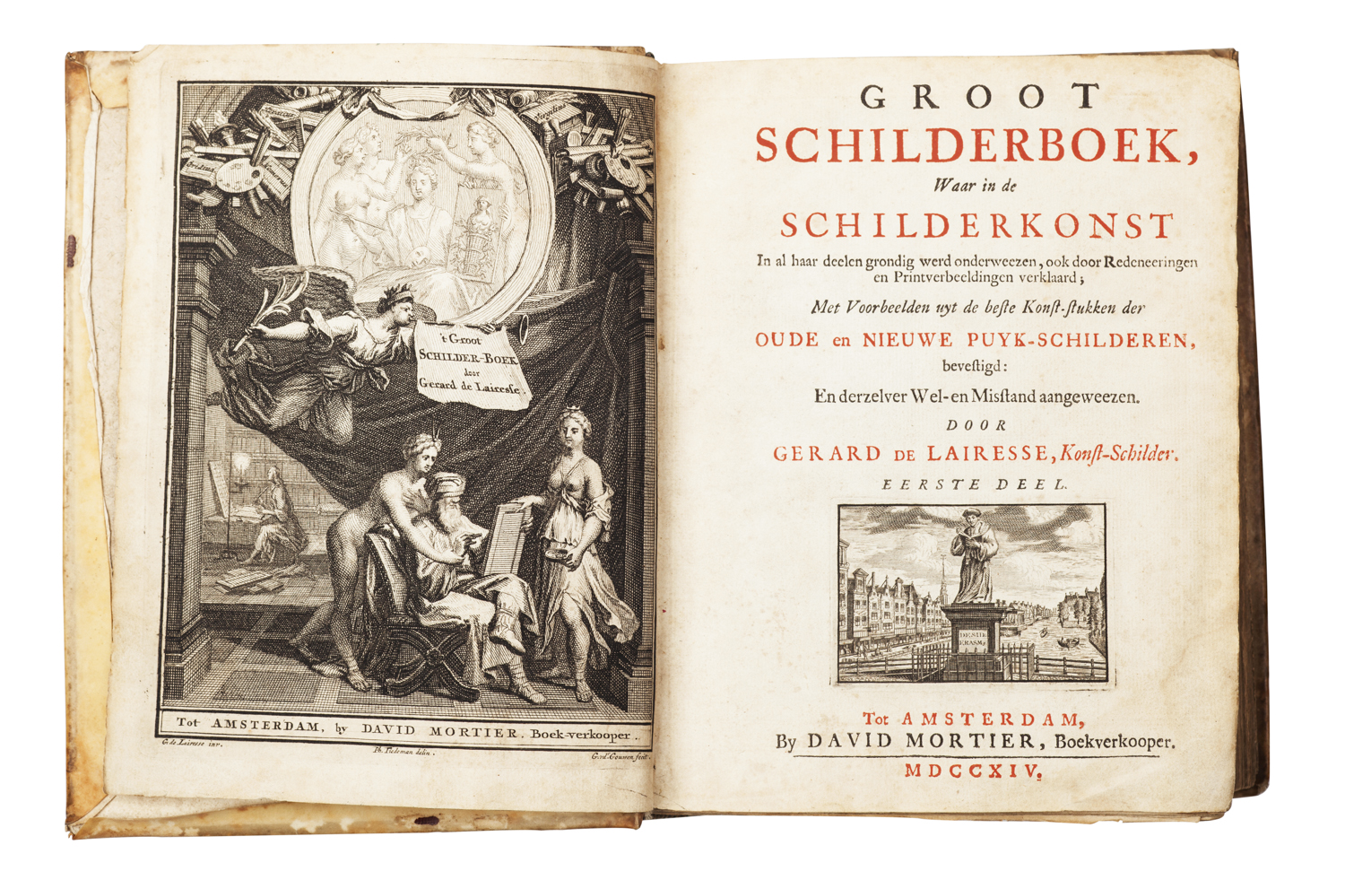 Groot Schilderboek, waar in de Schilderkonst in al haar deelen grondig werd onderweezen. Amsterdam: D. Mortier, 1714. First edition, 4to, 2 volumes in one, 2 engraved frontispieces and 66 engraved plates (12 folding), contemporary vellum