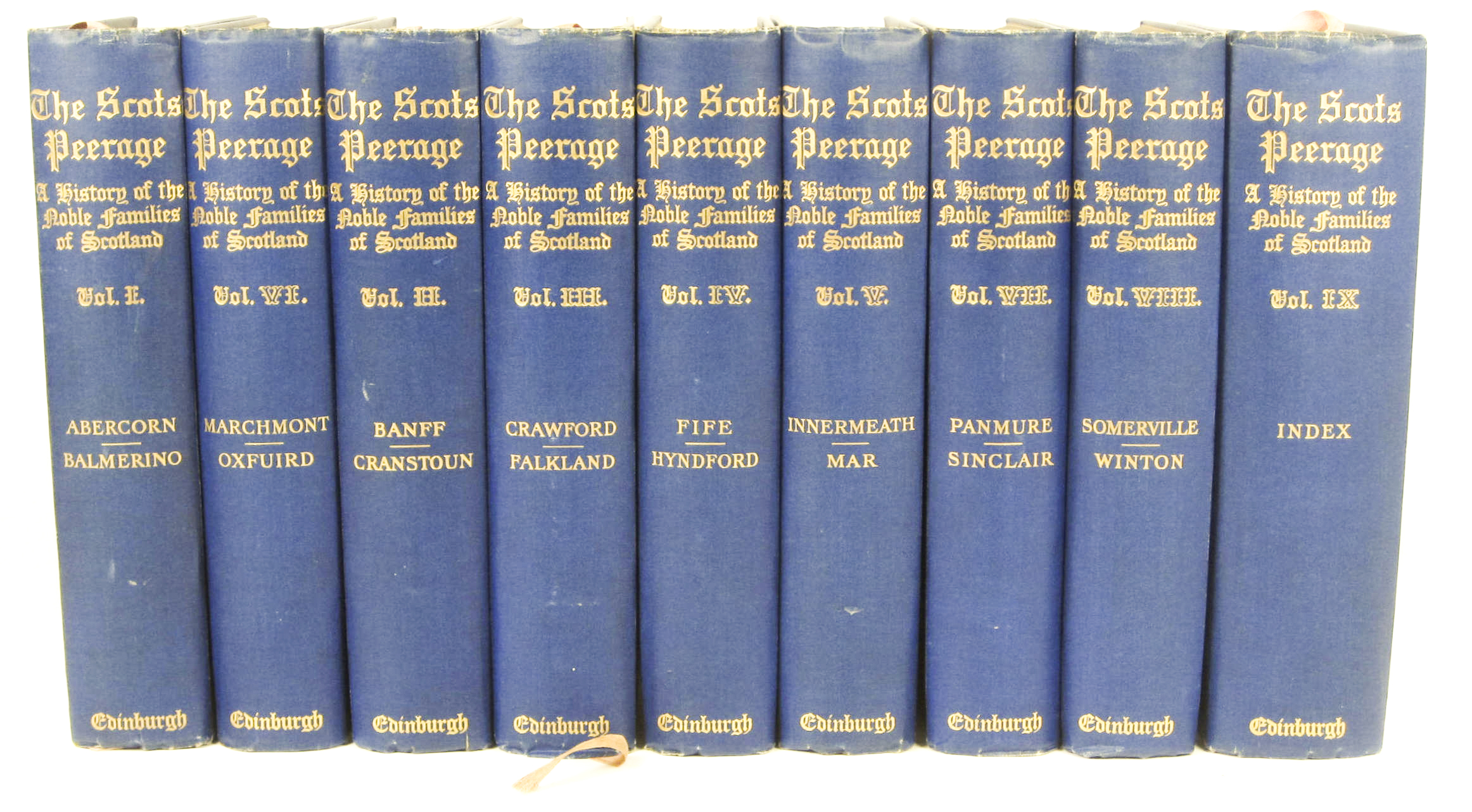 The Scots Peerage. Edinburgh: D. Douglas, 1904-14. 9 volumes, 8vo, plates, original blue cloth gilt