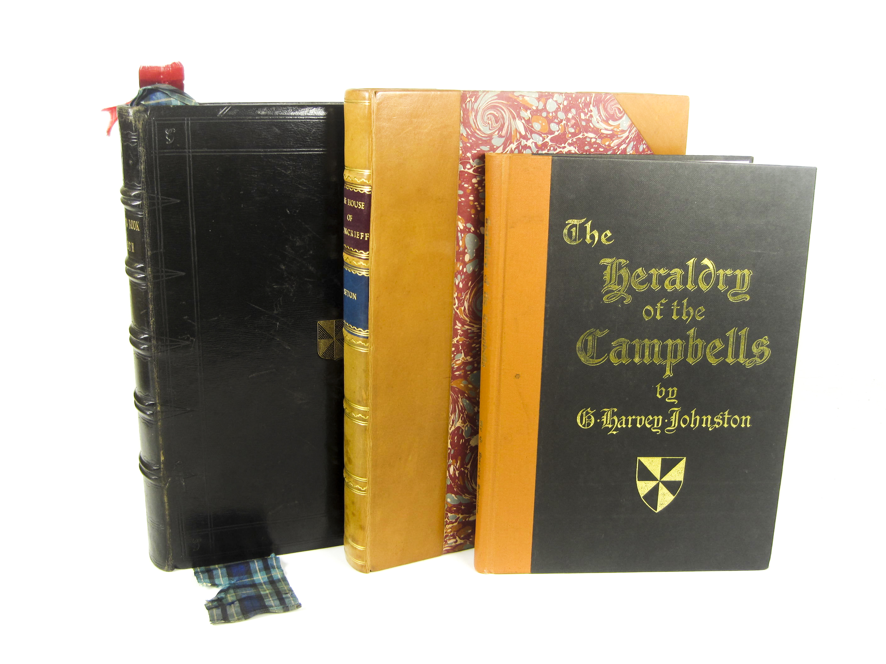 The black book of Taymouth, with other papers from the Breadalbane charter-room. Edinburgh: T. Constable, 1855. 4to, 2 plain plates, 9 hand-finished colour plates and facsimile letter, black calf gilt, silk marker and silk endpapers in tartan of the Campbells of Breadalbane, g.e.; Seton, George The house of Moncrieff. Edinburgh, 1890. 4to, number 130 of 150 copies, heraldic frontispiece, 6 genealogical tables and various colour shields throughout text, modern half calf, bookplates; Johnston, G. Harvey The heraldry of the Campbells. Inverary: Beinn Bhuidie Holdings Limited, 1977. Small 4to, original cloth (3)