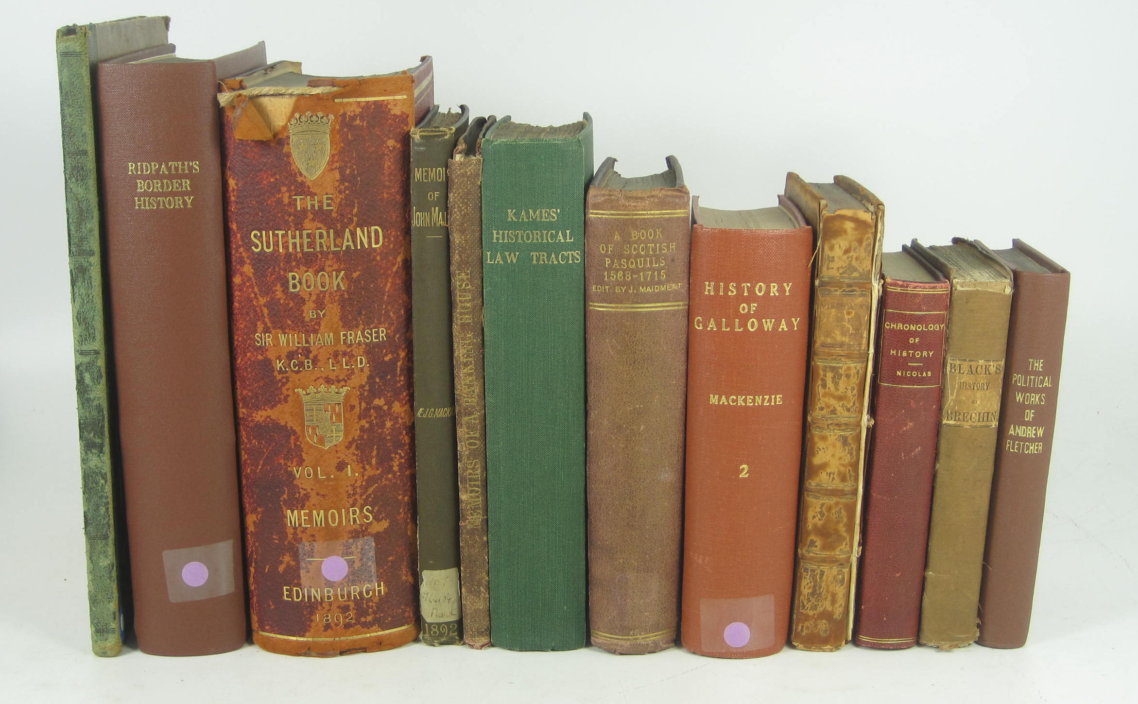 The political works. Glasgow: G. Hamilton & J. Balfour, 1749. 8vo, modern cloth; [Tytler, William] An historical and critical enquiry into the evidence produced by the Earls of Murray and Morton, against Mary Queen of Scots..., 1760. 8vo, contemporary calf, upper cover detached; Ridpath, George The border-history of England and Scotland..., 1776. 4to, modern brown cloth; [Kames, Henry Home, Lord] Historical law-tracts. Edinburgh, 1792. Fourth edition, 8vo, modern green cloth; Golag, William, editor Rentall of the county of Perth... Perth: Morisons, 1835. 4to, green quarter morocco; Black, David D. The history of Brechin... Brechin: Alexander Black, 1839. 8vo, contemporary purple cloth; [Symson, Andrew - William Mackenzie] The history of Galloway, from the earliest period to the present time. Kircudbright, 1841. Volume 2 only, 8vo, modern cloth; Forbes, Sir William Memoirs of a banking-house, 1860. 8vo, original purple cloth gilt; Maidment, James, editor] A book of Scotish [sic.] pasquils, 1568-1715. Edinburgh, 1868. 8vo, original purple cloth; Fraser, Sir William The Sutherland book, 1892. Volume 1 only, 4to, original red morocco gilt; MacKay, AE. J.G. Memoir of John Major of Haddington... Edinburgh, 1892. 8vo, original cloth gilt; Nicolas, Sir Harris The chronology of history..., [n.d.] New edition, 8vo, quarter red morocco, all with cancelled Edinburgh University Library stamps; sold not subject to return (12)