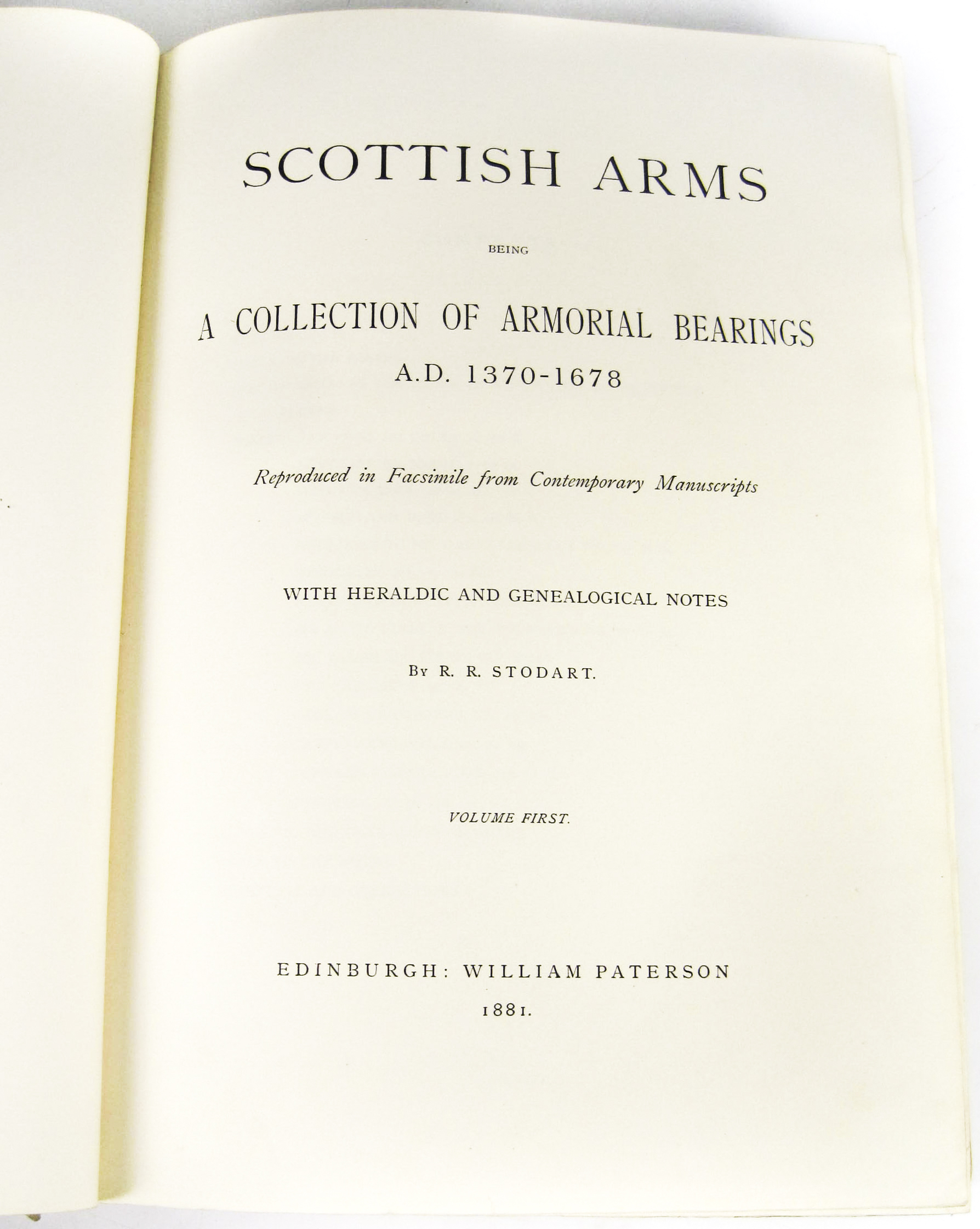 Scottish arms, being a collection of armorial bearings A.D. 1370-1678. Edinburgh: William Paterson, 1881. 2 volumes, folio, number 175 of 300 small paper copies signed by the publisher, 126 colour plates, original cloth gilt, bookplates, some wear and soiling