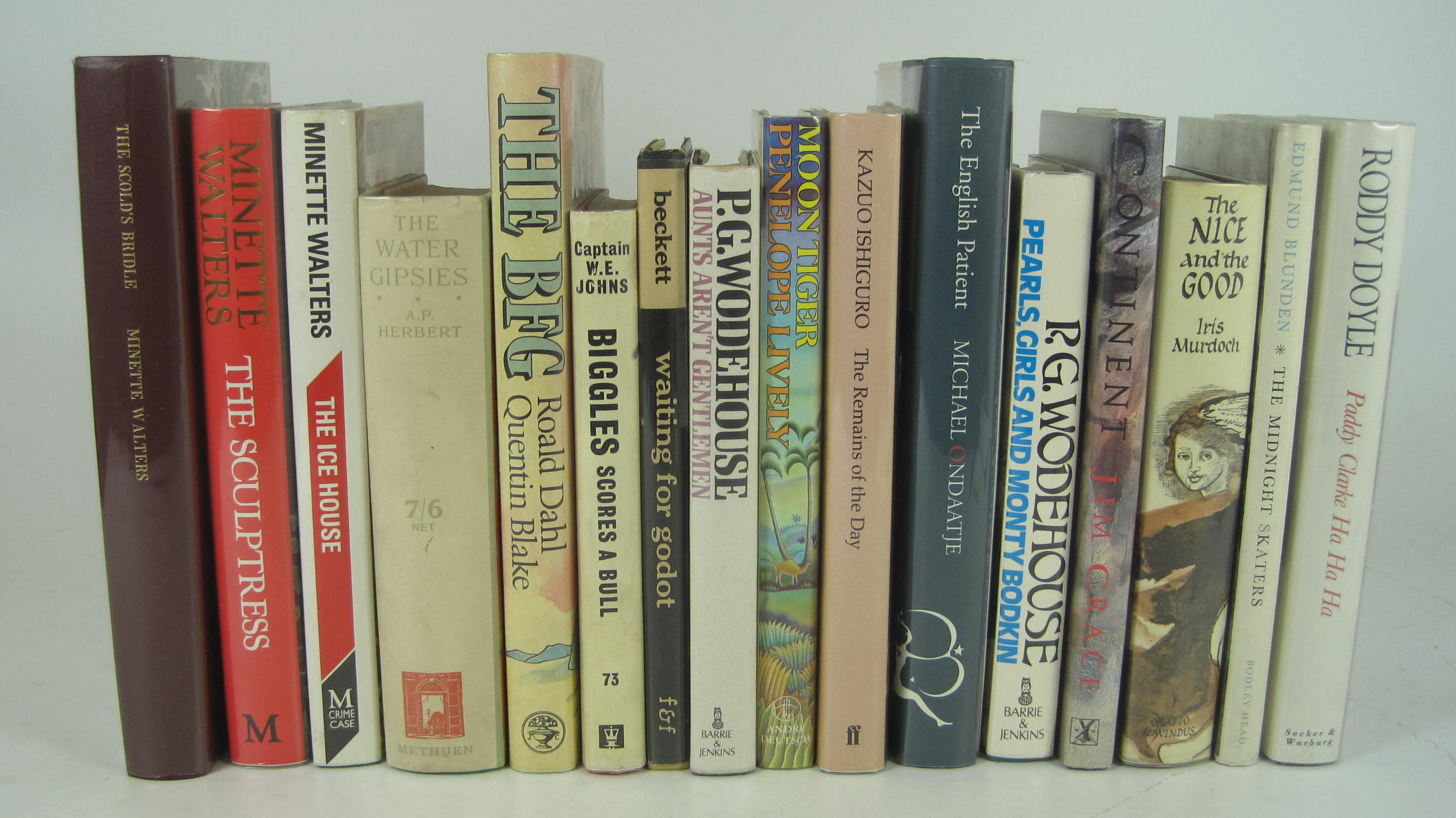 The scold's bridle. Scorpion Press, 1994. Number 72 of 75 copies signed by the author, quarter morocco; Walters, M. The Ice house. 1992. First edition, dustwrapperWalters, M. The sculptress. 1993. First edition, dustwrapper; Herbert, A.P. The water gypsies.1930. First edition, signed by the author, dustwrapper; Dahl, Roald The BFG. J. Cape, 1982. First edition, dustwrapper; Johns, W.E. Biggles scores a bull. 1965. First edition, dustwrapper, front endpaper darkened; Beckett, Samuel Waiting for Godot. 1956. First English edition, dustwrapper, front endpaper darkened; Wodehouse, P.G. Aunts aren't gentlemen. 1974. First edition, dustwrapper, price clipped; Wodehouse, P.G. Pearls, girls and Monty Bodkin. 1972. First edition, dustwrapper; Lively, Penelope Moon Tiger. 1987. First edition, dustwrapper, signed by the author; Ishiguro, Kazuo The remains of the day. 1989. First edition, dustwrapper; Ondaatje, Michael The English patient. 1992. First edition, dustwrapper; Crace, Jim. Continent. 1986. First edition, signed by the author on title, dustwrapper; Murdoch, Iris The nice and the good. 1968. First edition, dustwrapper; Blunden, Edmund The midnight skaters. 1968. Dustwrapper; Doyle, Roddy Paddy Clarke Ha Ha Ha. 1993. First edition, dustwrapper; none price clipped except where noted (16)