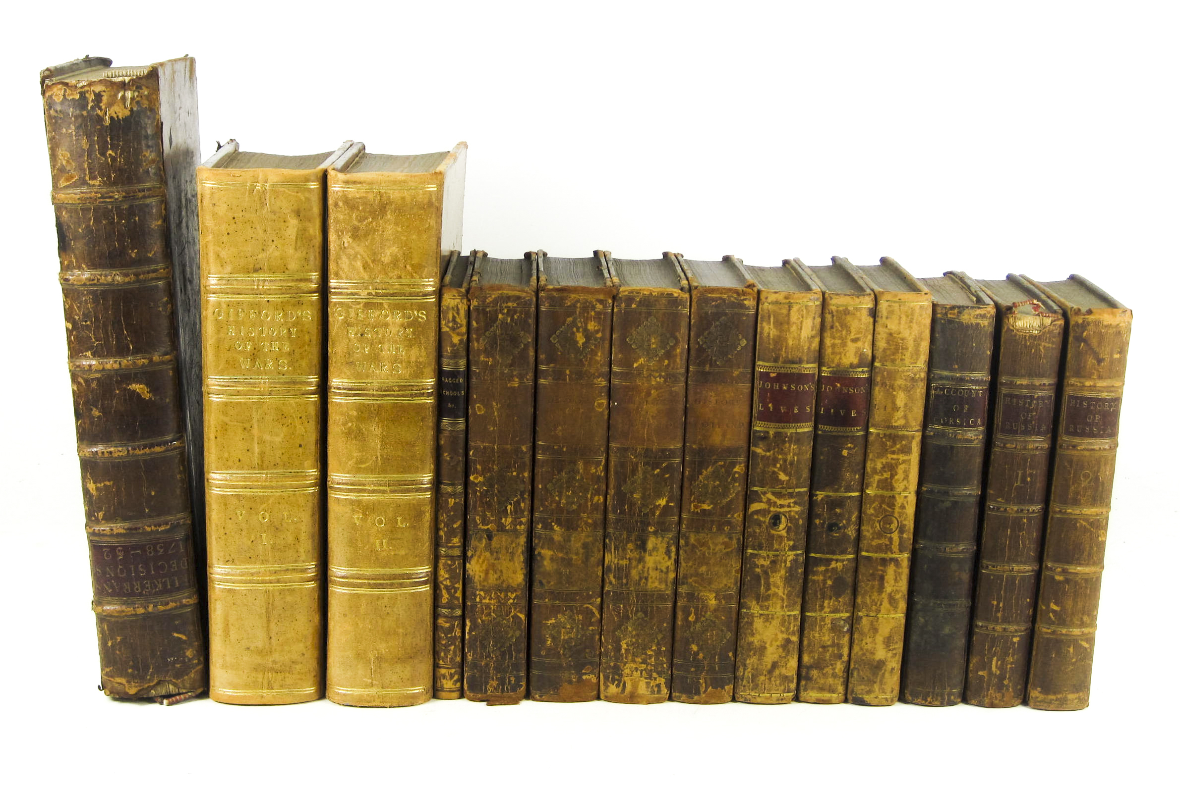 An account of Corsica... Glasgow, 1768. 8vo, contemporary calf; Gifford, C.H. History of the wars occasioned by the French revolution..., 1817. 2 volumes, 4to, later speckled calf gilt; Voltaire The history of the Russian empire, [1763?] 2 volumes, 8vo, contemporary calf; Decisions of the court of session from...1738 to...1752. Edinburgh, 1775. Folio, contemporary calf; Johnson, Samuel The lives of the most eminent English poets, 1806. 3 volumes, 8vo, contemporary calf; [Guthrie, Thomas?] [A second plea for ragged schools], [n.d., 1860?] 8vo, lacks title; bound with another text, contemporary half calf; Aikman, James The history of Scotland. Glasgow, 1827. 4 volumes, 8vo; and 8 other volumes, all with bookplates, sold not subject to return (22)