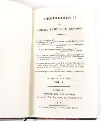 Prodigious!!! or, Childe Paddie in London. London: for the Author, and sold by Wm. Lindsell, 1818. First edition, 3 volumes, 12mo, contemporary half calf gilt, a fine copy