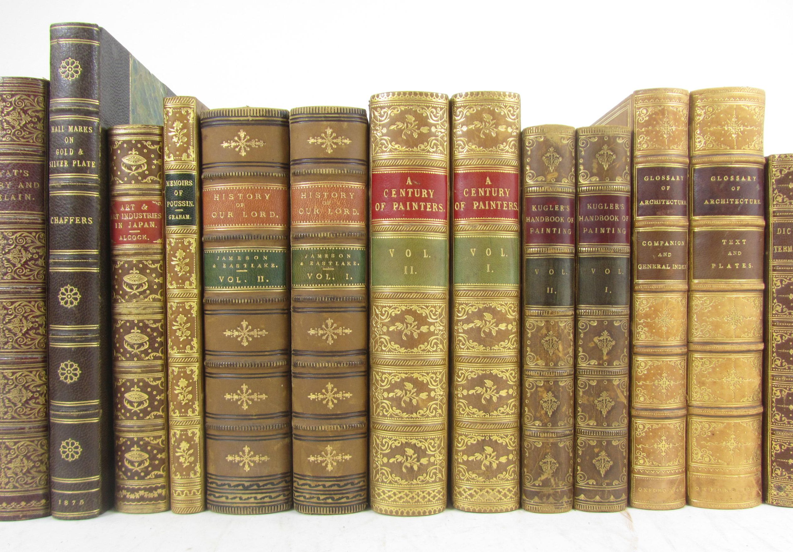 Waagen, Dr. Handbook of painting. 1860. 2 vol., half calf; Alcock, R. Art and art industries in Japan. 1878. 8vo, tan calf gilt; Graham, M. Memoirs of the life of Nicholas Poussin. 1820. 8vo, frontispiece, & plate, half calf gilt; Jameson, Mrs The history of Our Lord as exemplified in works of art. 1864. 2 vol., 8vo, plates, calf gilt; Redgrave, R. A century of painters of the English school. 1866. 2 vol., 8vo, calf gilt; Jameson Mrs Memoirs of early Italian painters. 1868. 8vo, calf gilt; Marryat, J. A history of pottery and porcelain. 1868. 8vo, maroon half morocco gilt; [Architecture] A glossary of terms used in Grecian, Roman, Italian and Gothic architecture. [& A companion]. 1840-46. 8vo, 2 vol., calf gilt; Fairholt, F.W. A dictionary in terms in art. [c.1870],. 8vo, half morocco gilt; Chaffers, W. Hall marks on gold and silver plate. 1875. 8vo, half morocco gilt; and 10 others (24)