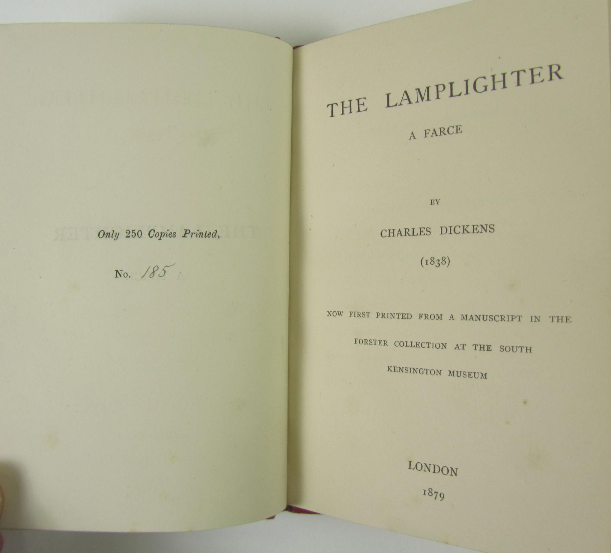 Sketches of young couples. London: Chapman and Hall, 1840. First edition, 12mo, 6 plates by "Phiz" [H.K. Browne], without half-title or adverts.; Dickens, C. The lamplighter. A farce, now first printed from a manuscript in the Forster collection. London, 1879. 12mo, number 185 of 250 copies, both contemporary red morocco-backed cloth, lettered in gilt, (2)