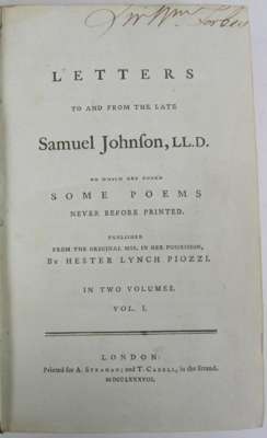 Letters to and from the late Samuel Johnson. London: A. Strahan and T. Cadell, 1788. First edition, 2 volumes, 8vo, errata slip pasted to verso of A8, contemporary half calf, bookplate and signature of author on title of Sir William Forbes Bt. of Pitsligo