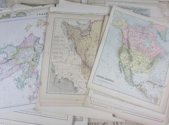 West India Islands: St. Christopher, St. Lucia, Nevis; Porto Rico and Virgin Isles, Haiti, Hispanola or St. Domingo; Martinico, Dominica; 3 maps, Edinburgh, [1815], hand-coloured in outline, each c.55 x 67cm; [Idem] Spanish North America, southern part. [Edinburgh, c.1830?] hand-coloured in outline, 54.5 x 68.5cm; [Idem] Europe after the congress of Vienna, 2 (of 4) maps showing the southern part of the continent, [Edinburgh], 1816, hand-coloured, 56 x73.5 cm; Society for the Diffusion of Useful Knowledge Australia in 1839. London: Charles Knight, [1840], c.34 x41 cm; Johnston, A.K. India; Italy, north part; Italy, south part; all Edinburgh, [c.1850], hand-coloured in outline, c.65 x53 cm; and a large quantity of other maps from around the world, sold not subject to return (224)