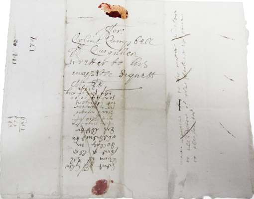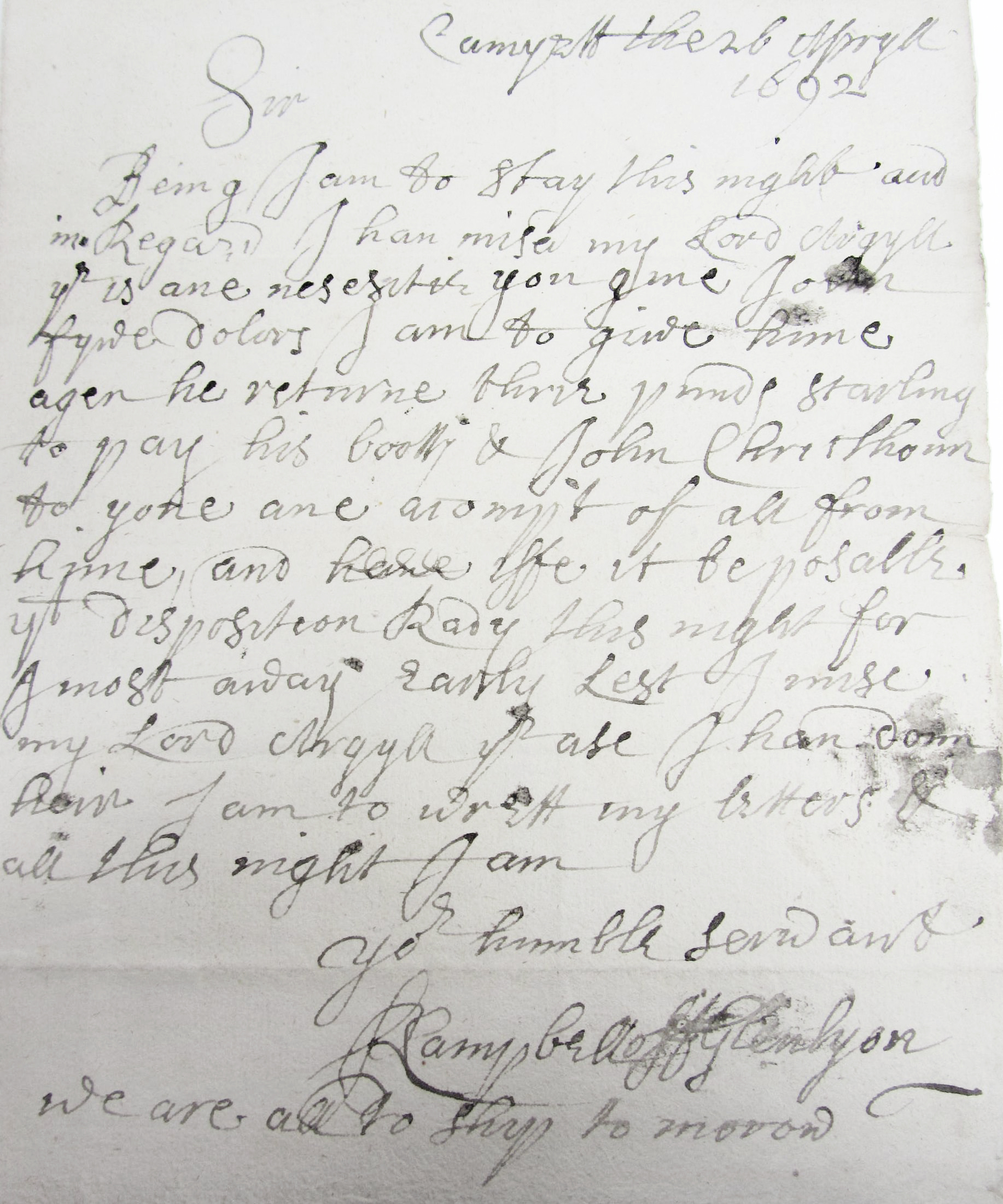 Letter, c.20x16.5cm, dated 1692, with address and seal to verso, on one side of folded paper, from Captain Robert Campbell of Glenlyon addressed to Colin Campbell of Carquhen, asking him to pay John Christhom 5 dolars and writing that he has given him £3 to pay his 'booty', Campbell states that he has missed Lord Argyll and must be away