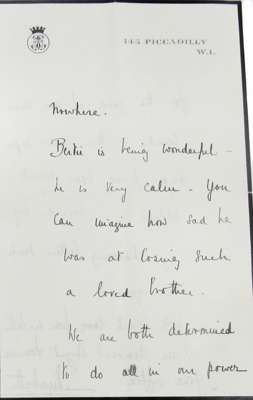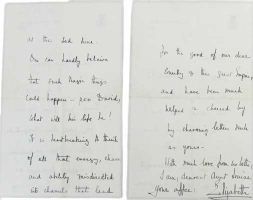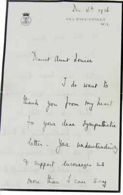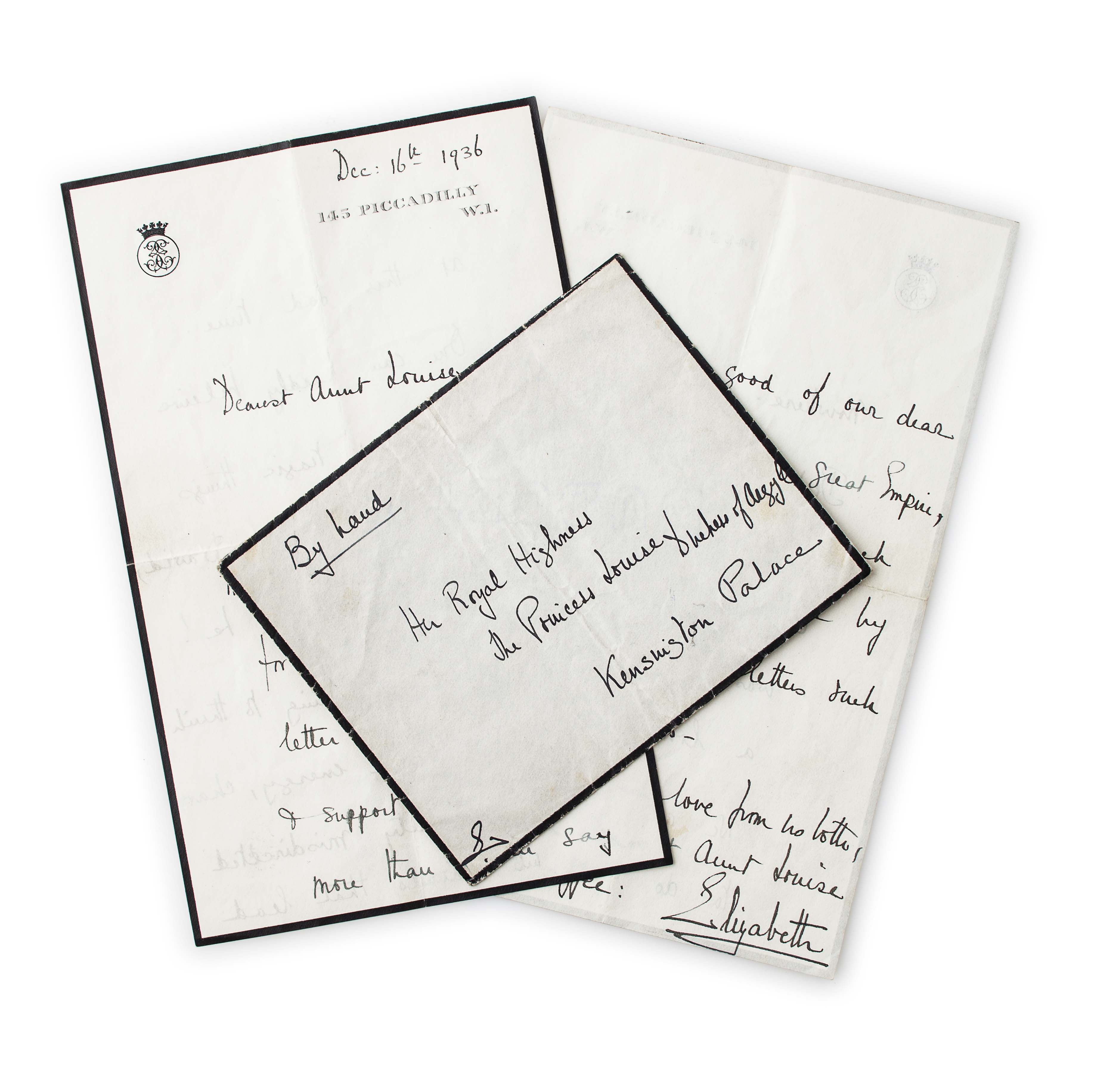 4pp. autograph letter on two sheets signed from Queen Elizabeth (the Queen Mother), dated December 16th 1936, written on '145 Piccadilly W1' black-edged note paper, with unfranked envelope (delivered by hand) addressed to Her Royal Highness the Princess Louise Duchess of Argyll, thanking the Duchess for her sympathy regarding the abdication of Edward VIII: "I do want to thank you from my heart for your dear sympathetic letter... poor David, what will his life be! It is heartbreaking to think of all that energy, charm and ability misdirected... Bertie is being wonderful - he is very calm..."