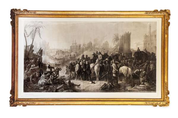 Two large framed prints engraved by Thomas J. Barker after military scenes by Charles Lewis: The allied generals with the officers of their respective staffs before Sebastopol Manchester: Thomas Agnew & Sons /Leicestershire: John Garle Brown, 1859, c.70 x 130cm to plate line; The relief of Lucknow & the triumphant meeting of Havelock, Outram & Sir Colin Campbell [N.p., n.d. but Manchester: Thomas Agnew & Sons, 1862?]; uniform glazed gilt wood frames (2)