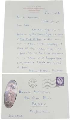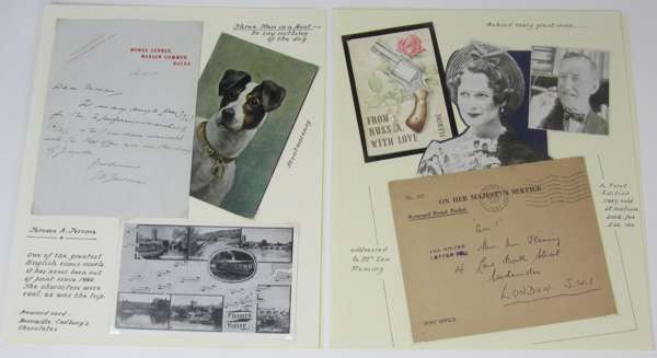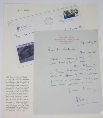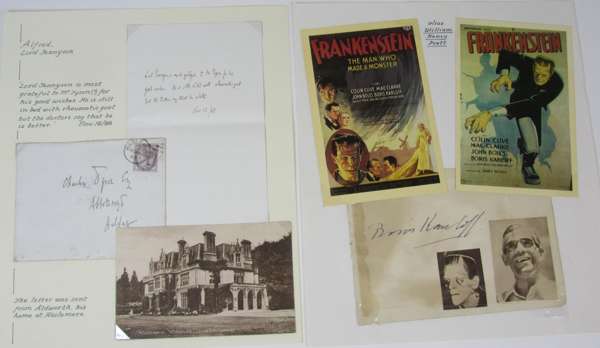 A.L.S. to Charles Tyson, saying that "he is still in bed with rheumatic gout but the doctors say that he is better", 15 Nov., 1888, with envelope; Jerome, Jerome K. A.L.S. to an unknown correspondent, stating his fee for 2 performances, 16 Nov., 15; Bates, H.E. A.L.S. to Mr Malcolm, stating that A Moment in Time "is about the affairs of 1940", 16 Sept. 1961, with First Day Cover envelope, also signed; Bates, H.E. A.L.S. referring to editions of The greatest people in the world and How sleep the brave, 10 Jan. 1964; Fleming, Ian Envelope addressed to Mrs Ian Fleming, 1957; Karloff, Boris "William Henry Pratt" Small photograph (6x5cm.) and illustration (5 x 4cm.), signed, slightly browned (6)