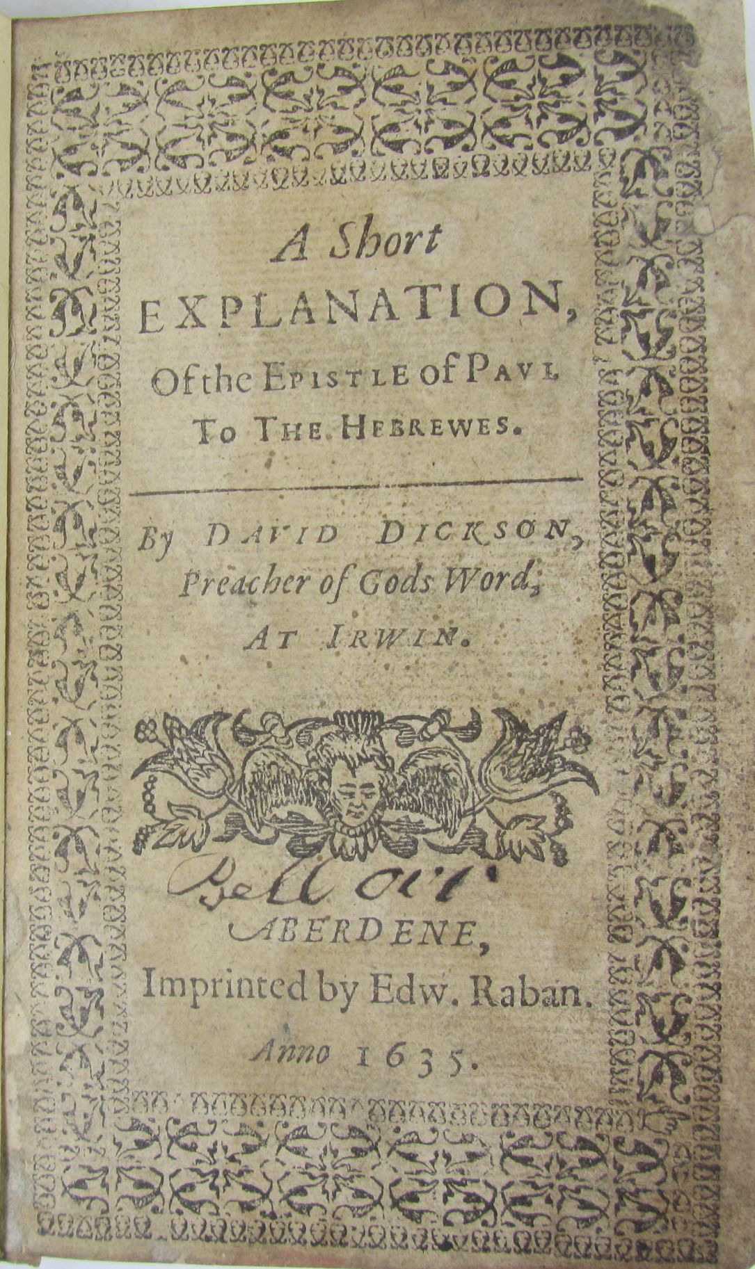 A short explanation of the epistle of Paul to the Hebrewes. Aberdeen: Edw. Raban, 1635. 12mo, paper flaw to K3/K4, some staining and soiling, title laid down, without *1 [blank], marginal repair to *2 brown morocco gilt, bookplate of Catherine Kinnear, some leaves trimmed with occasional loss of text, [STC (2nd ed.), 6824]