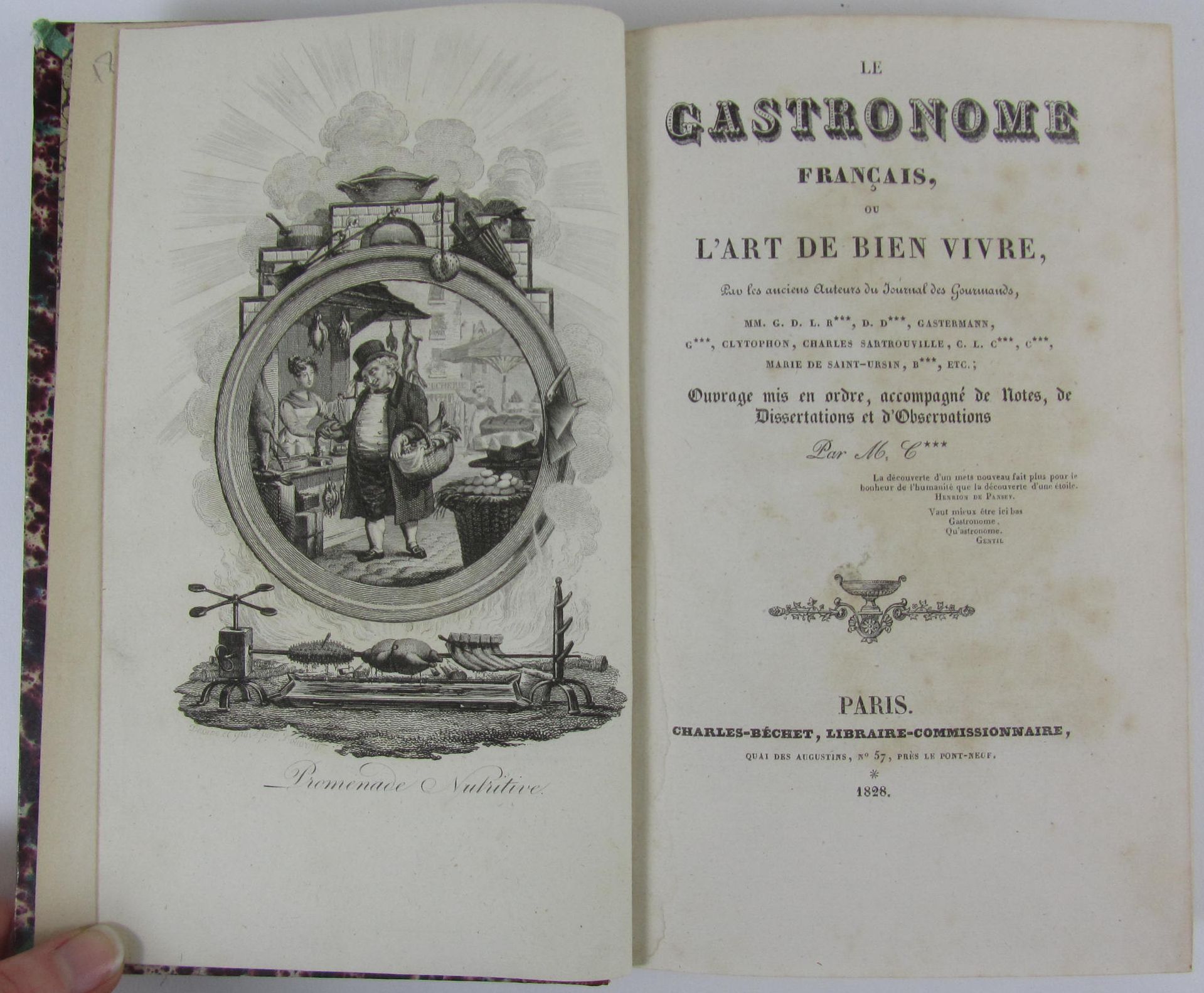 L'art de conserver, pendent plusieurs années, toutes les substances animals et végétales. Paris: Patris et Cie, 1810. First edition, 8vo, half-title signed verso by author, folding plate, later morocco backed boards; Le gastronome français, ou l'art de bien vivre. Paris: Charles-Béchet, 1828, 8vo, half-title, engraved frontispiece, red morocco-backed boards, spine gilt in compartments; both from the collection of Stanley Seeger (2)