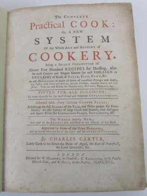 The complete practical cook: or, a new system of the whole art and mystery of cookery. London: W. Meadows and Others, 1730. 4to, first edition, title printed in red and black, 60 engraved plates, 3 folding, recent speckled calf in period style, from the collection of Stanley Seeger, some slight dampstaining and browning, title a little soiled