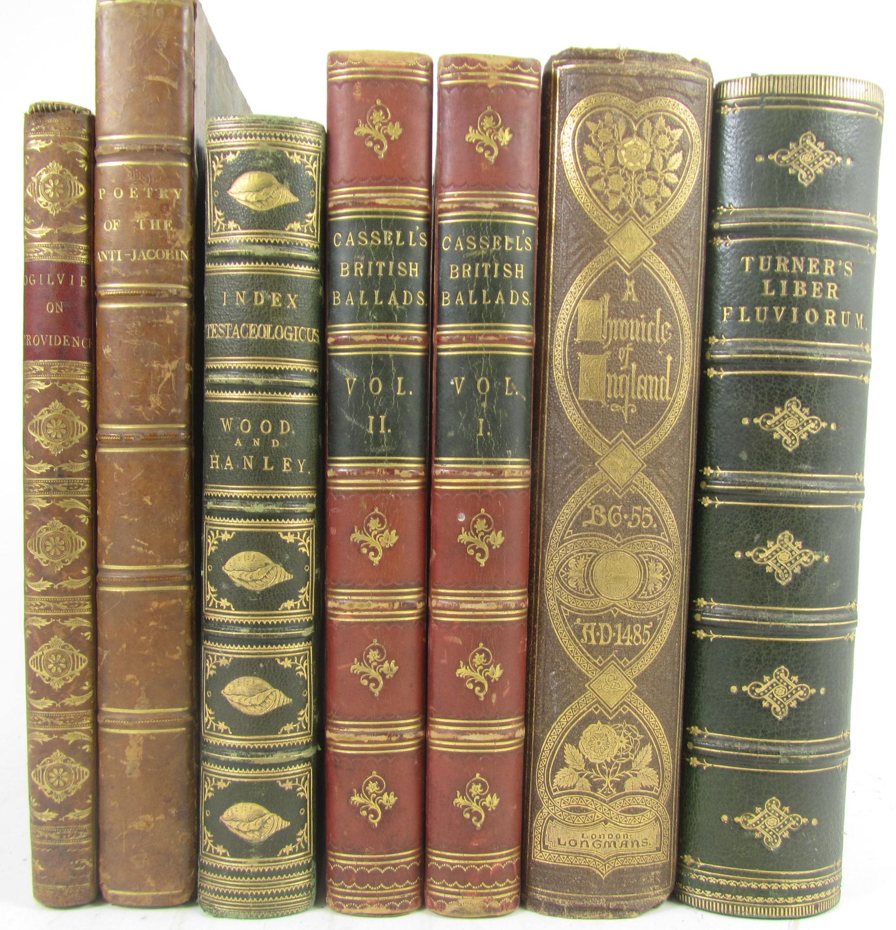 Providence, an allegorical poem. London, 1764. 4to, 3 engraved plates, contemporary calf gilt; Watson, A. Poetry of the anti-Jacobin. London, 1801. 4to, contemporary half calf, slightly rubbed; Wood, W. Index testaceologocius, an illustrated catalogue of British and Foreign shells. 1856. 8vo, 46 hand-coloured plates, publishers' green half morocco gilt, lightly rubbed; Turner, J.M.W. Liber fluviorum, or River Scenery of France. London, 1853. 8vo, 61 engraved plates, green half morocco gilt, g.e.; Doyle, J.E. A chronicle of England. 1864. 4to, original cloth gilt; Smith, G.B. Illustrated British ballads. 1881. 2 vol., 4to, illustrations, red half calf gilt (7)