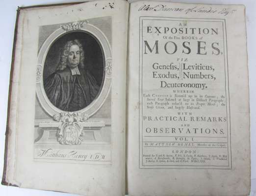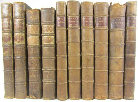 An exposition of the five books of Moses. London: J. & B. Sprint, 1721. 6 volumes, folio, engraved frontispiece, contemporary panelled calf, some wear; Ridgeley, Thomas A body of divinity. London, 1734-33. 2 volumes, folio, engraved portrait, contemporary calf; Charnock, Stephen The works. London, 1699. 2 volumes, folio, engraved portrait, contemporary calf, somewhat spotted (10)