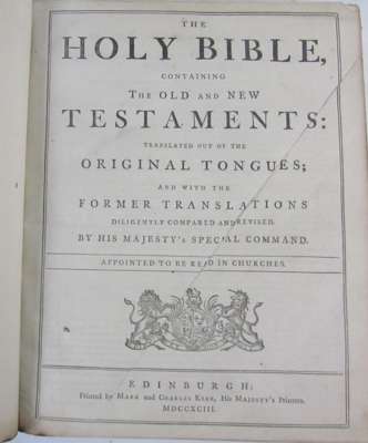Edinburgh: Mark and Charles Kerr, 1793. 4to, nineteenth century black morocco, neatly rebacked, spine gilt, corners rubbed; The Holy Bible Oxford: Thomas Baskett, Printer to the University, [1759]. 8vo, engraved title, 19th century calf, some spotting and soiling (especially to title), some marginal notes trimmed; sold not subject to return (2)