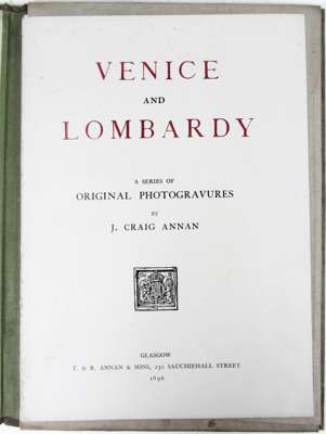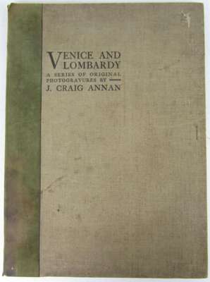 Venice and Lombardy, a series of original photogravures... Glasgow: T. & R. Annan & Sons, 1896. Small folio, number 31 of 75 copies, title-page in red and black, 9 (of 11) loose mounted photogravures, each signed in pencil by Annan to photograph border, original quarter suede folder with title printed in black to upper cover, foxing/spotting to mounts and title, one plate a little creased, covers soiled, binding rubbed, lacks ties