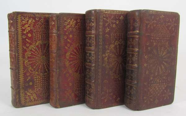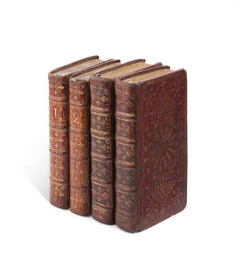 The holy Bible... Edinburgh: printed by Adrian Watkins, 1752. 2 volumes, 12mo, red morocco with gilt tooling to covers and spine, European gilt endpapers, ownership signatures to endpapers, some rubbing; The holy Bible... Edinburgh: Alexander Kincaid, 1764. 2 volumes, 12mo, red morocco with gilt tooling to covers and spine, European endpapers, each volume inscribed to Ann Elizabeth Watson, from her aunt, some rubbing, slight chipping and discolouration to parts (4)