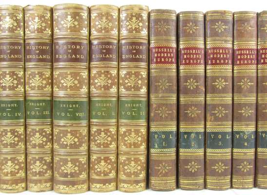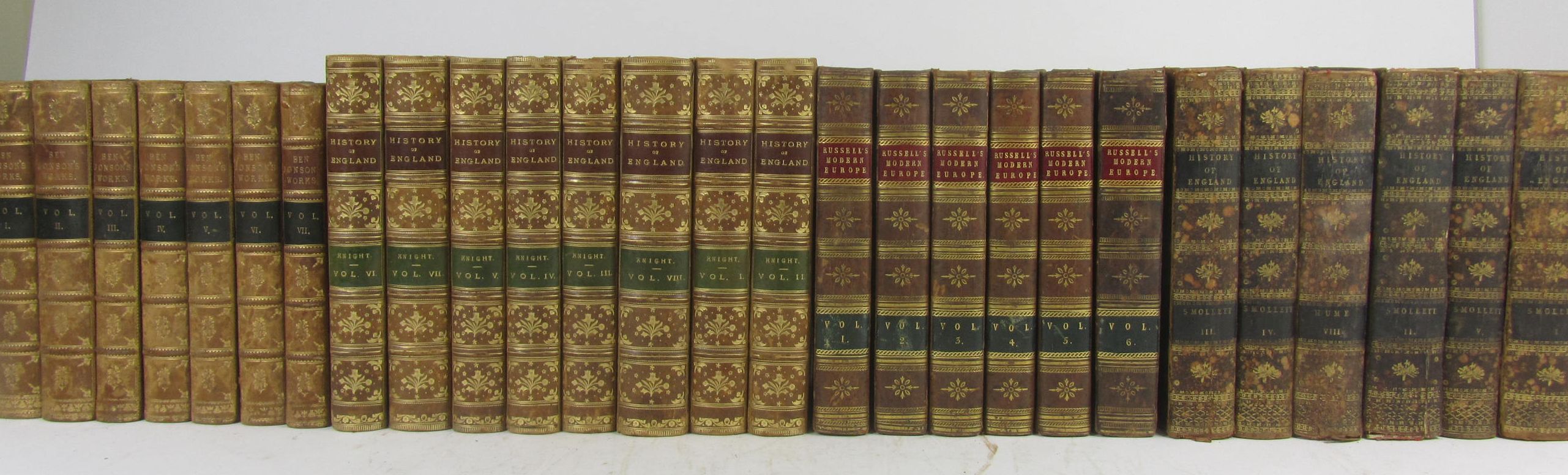 The popular history of England. 1859. 8 volumes, 8vo, contemporary half calf gilt; Russell, W. The history of modern Europe. 1805. 6 volumes, 8vo, contemporary calf gilt; Jonson, B. The works. 1756. 7 volumes, 8vo, frontispiece, nineteenth century half calf gilt; and 6 odd vol. of Hume (27)