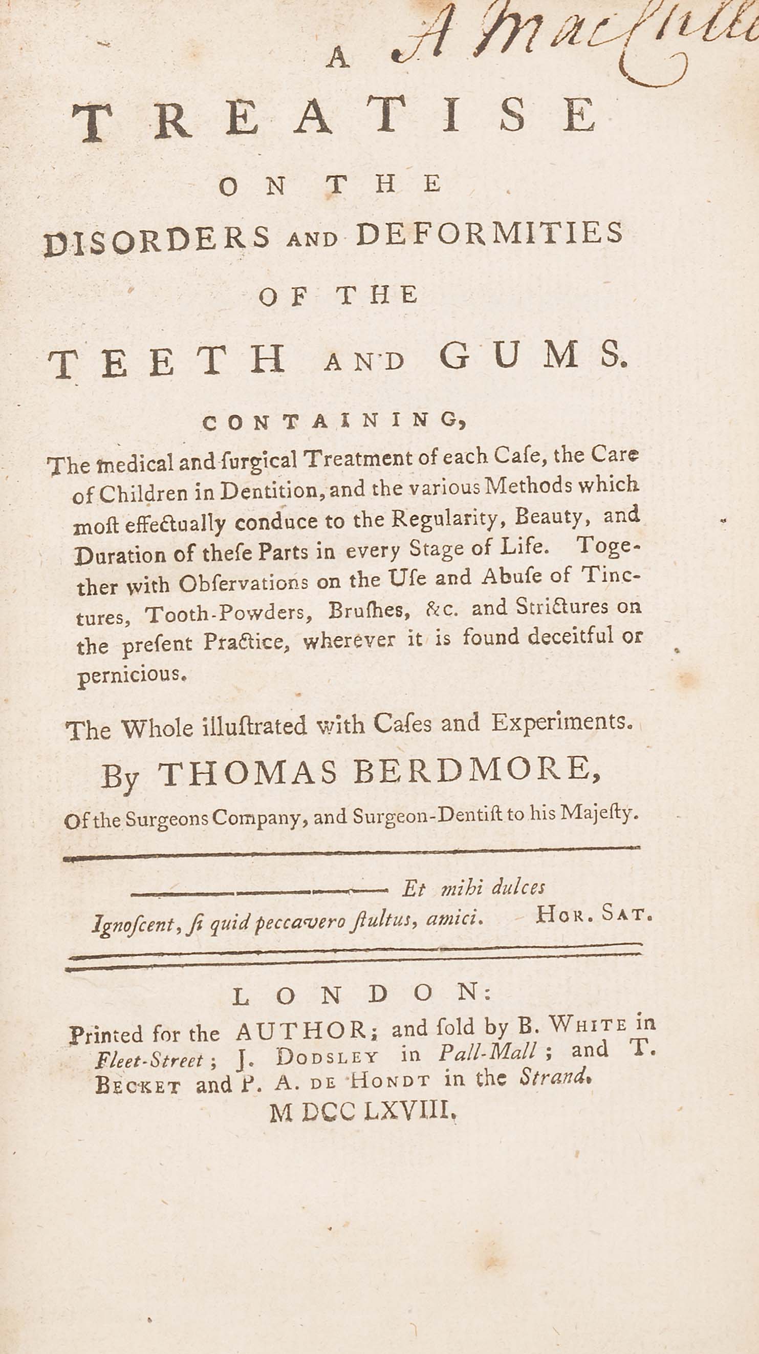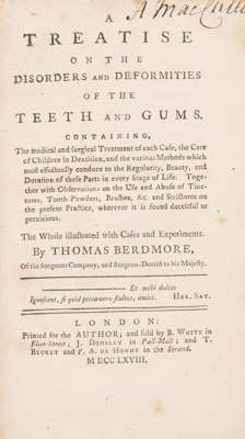 A treatise on the disorders and deformities of the teeth and gums. London: for the author, 1768. First edition, 8vo, (4) + xiipp - 267pp), contemporary marbled boards, rebacked in calf, calf corners, contemporary ownership inscription in ink on the title, [Garrison & Morton 3674; Menzies Campbell 15; Crowley 1515; not in Poletti or Weinberger]
