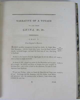 A narrative of the British embassy to China. London: J. Debett, 1795. 4to, contemporary half calf, red label to spine, bookplate of Lord Forbes, ownership inscription of Mary Irvine and stamp of Getty Oil, from the collection of Stanley Seeger, some wear to covers [ESTC T96963, with glossary of Chinese words and half-title]