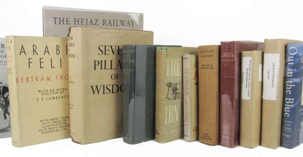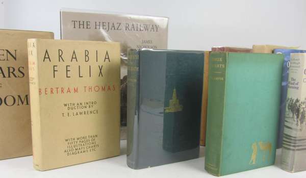 Arabia Felix. 1932, plates, dustwrapper; Lawrence, T.E. Seven pillars of wisdom. 1935. 4to, original brown buckram, dustwrapper; Bell, Gertrude L. Amurath to Amurath. 1924. Second edition, original pictorial cloth; Van der Meulen, D. The wells of Ibn Sa'ud. 1957. Dustwrapper slightly frayed; Gaury, G. de Arabian journey. 1950, dustwrapper; Nicholson, J. The Hejaz railway. 2005, signed by the author, dustwrapper; Bagnold, R.A. Libyan sands. [N.d.], quarter cloth; Desert Research. Proceedings International Symposium held in Jerusalem May 7-14, 1952. Jerusalem, 1953, 8vo, wrappers; Bierman, J. The secret life of Laszlo Almasy. 2004, presentation copy signed, dustwrapper; Kelly, Saul The hunt for Zerzura. 2002, presentation copy signed, dustwrapper; Barger, Thomas C. Out in the blue, letters from Arabia 1937 - 1940. 2000, presentation copy signed, dustwrapper; and 39 secondhand volumes relating to the Middle East (51)