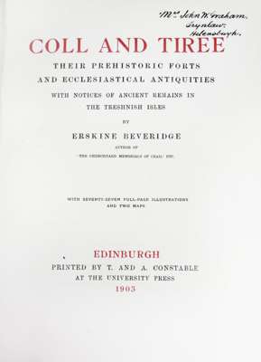 Coll and Tiree, their prehistoric forts and ecclesiastical antiquities. Edinburgh: T. and A. Constable, 1903. 4to, number 272 of 300, 2 maps (1 folding), original quarter morocco gilt, bookplate to endpaper, ownership inscription to title-page