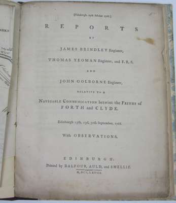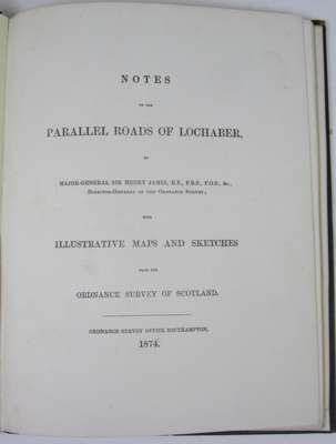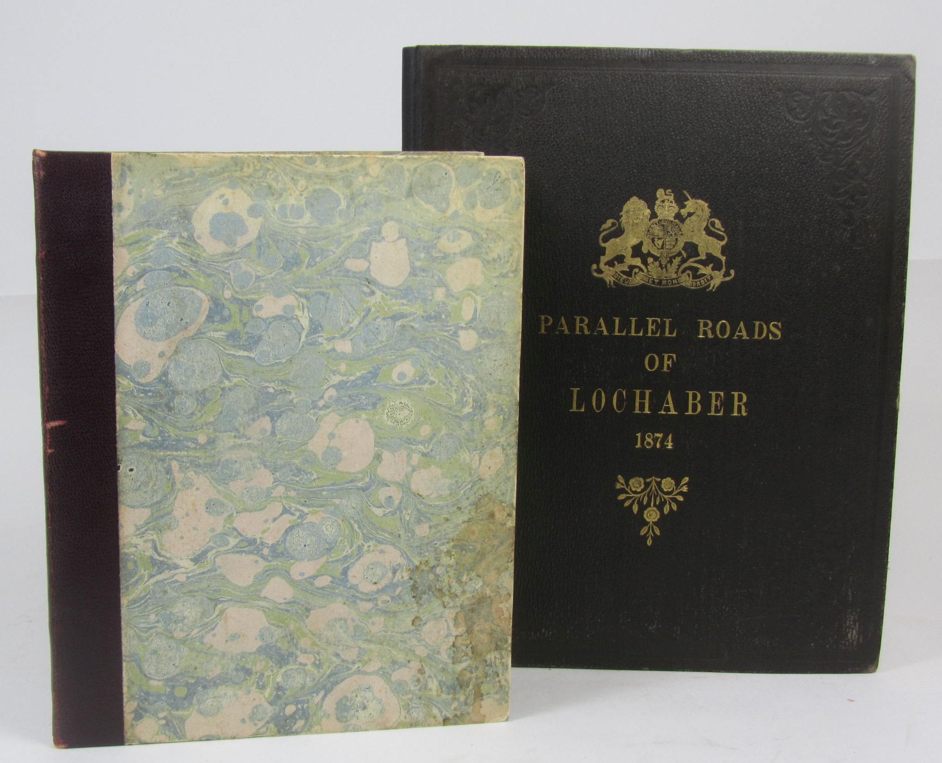 Reports relative to a navigable communication betwixt the firths of Forth and Clyde. Edinburgh: printed by Balfour, Auld and Smellie, 1768. 4to, folding engraved map, modern red quarter morocco gilt, map torn [ESTC T44890, listing 5 copies in libraries in the British Isles and 2 in North American libraries]; James, Sir Henry, Major-General Notes on the parallel roads of Lochaber... Southampton: Ordnance Survey Office, 1874. 4to, original green morocco gilt (2)