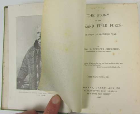 The story of the Malakand Field Force. London: Longmans [&c.], 1898. First edition, 8vo, 3 maps (2 folding) and 4 plates, errata slip, original green cloth, 4 plates dampstained, some spotting, binding a little soiled, stain to lower cover, publisher's catalogue present, 32pp, dated 3/98, occasional scoring in blank ink (ie p. 67)