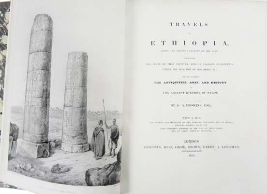 Travels in Ethiopia. London: Longman [&c.], 1835. First edition, 4to, [xx, 367], 54 lithographed plates (2 hand-coloured, 4 chromolithographed) and 1 folding map, illustrations, nineteenth century half calf, bookplate of Edward Blore, some spotting to map and plates