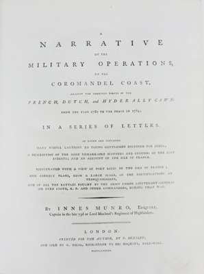 A narrative of military operations on the Coromandel Coast. London: for the author by T. Bensey, 1789. 4to, half calf, 9 folding maps, folding plate, bookplate of Lord Forbes, ownership stamp of Getty Oil, from the collection of Stanley Seeger, some wear and cracking to joints [ESTC T106034]