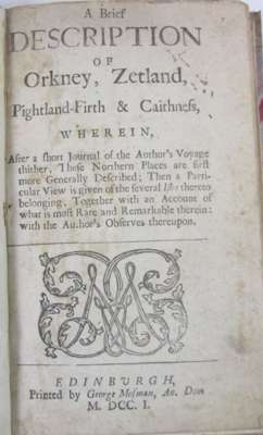 A brief description of Orkney, Zetland, Pightland-Firth & Caithness. Edinburgh: George Mosman, 1701. 8vo, [xii, 159, v], contemporary calf-backed marbled boards, bookplate of Sir James Colquhoun of Luss Bart, title lightly soiled