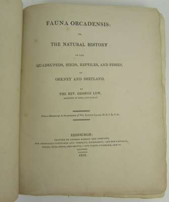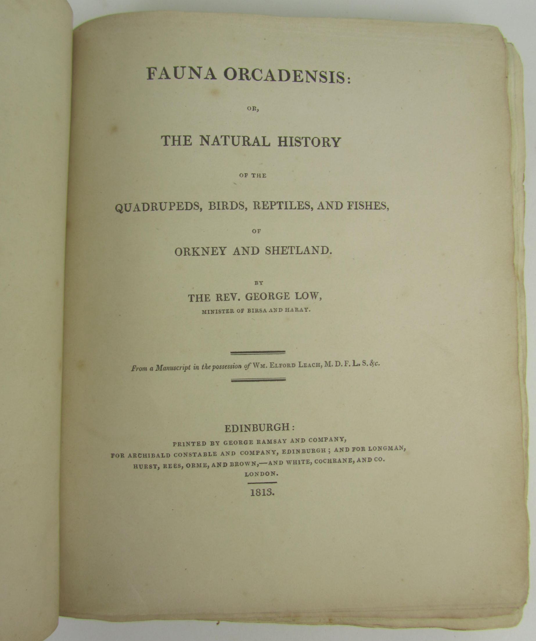 Fauna Orcadensis: or, the natural history of the quadrupeds, birds, reptiles, and fishes of Orkney and Shetland. Edinburgh: Archibald Constable and Company, 1813. 4to, half-title, 2 leaves of advertisements, pp.xvii-xx misbound, original? blue boards rebacked with modern calf spine and corners, endpapers renewed, some foxing and spotting