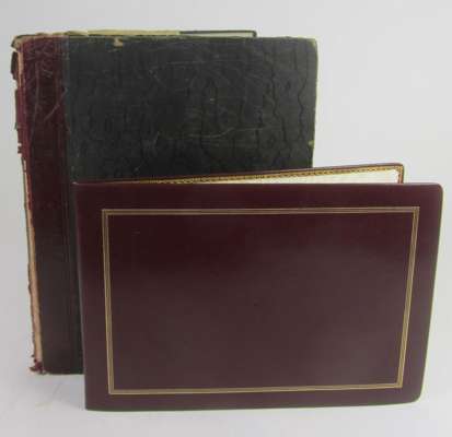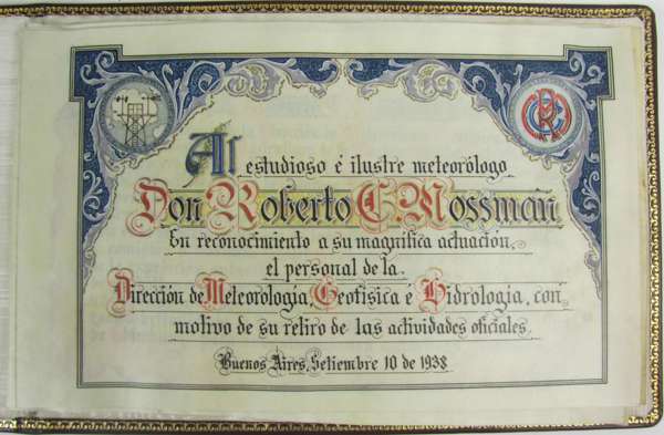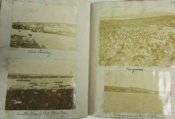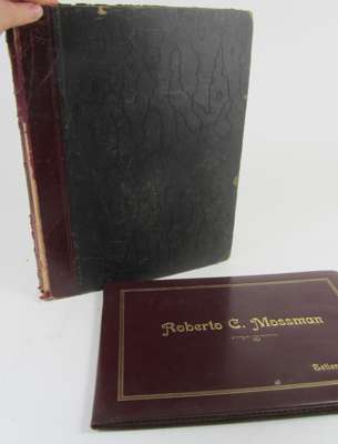 Scrapbook, c.32x26cm, containing a record of the experiences of Robert C. Mossman, meteorologist on board the Antarctic Ship "Scotia", comprising: 17 letters written by Robert Mossman to his father and another relation, Isabella, charting his journey and experiences on board the ship, visiting destinations on his journey South such as Kingstown in Ireland, Madeira, the Cape Verde Islands, Port Stanley, the South Orkneys and Buenos Aires, written between 1902 and 1905, many mentioning other crew members, wildlife, living conditions and his meteorological work; also a letter from expedition leader William Bruce to Mossman's father, from Port Stanley on 9th February 1904, relating to Robert's work; also 7 faded photographs, between c.12 x 16 and 16 x 20cm, taken at Port Stanley and sent home by Robert Mossman, showing penguins, a 'sea elephant', and views of Port Stanley - the images were engraved and reproduced in the 'Edinburgh Evening Dispatch'; also 3 smaller very faded photographs showing men on board a ship; also many newspaper clippings and magazine offprints relating to the expedition, such as: Bruce, W.S. The Scottish Antarctic expedition [offprint from?] The Scottish Geographical Magazine, June 1990, blue wrappers, map; [AND] Illuminated calligraphic manuscript produced [in Buenos Aires?] for Mossman on the occasion of his retirement in 1938, comprising 12 vellum leaves with a full-page illustration of the South Orkneys, signed G. Siniscalchi, A.R. Politi and C.A. Navarro to final page, album c.21 x 30cm, red calf gilt; [AND] Album containing at least 19 photographs of Buenos Aires and Argentina and one of Brazilian women (3)