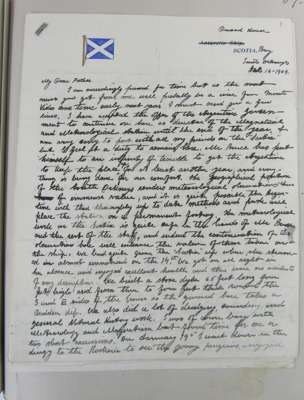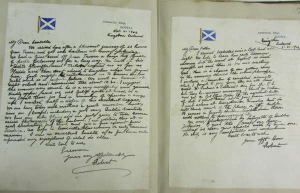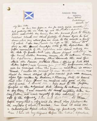 The "Antarctic Ship Scotia", in which the expedition members sailed, was a refurbished Norwegian whaling ship. It was transformed into an Antarctic research vessel under Bruce's supervision. Robert Mossman was one of the six scientific personnel on board the ship and was the appointed meteorologist and expert in magnetics. Educated at the Edinburgh Royal High School, Mossman became involved with meteorological work on Ben Nevis before embarking on the Scottish Antarctic Expedition. His letters to his father and Isabella give an excellent impression of his journey: he describes flying fish landing on deck near the Cape Verde Islands, shark infested waters before reaching Port Stanley, Christmas dinner on board the ship, catching a sunfish with a harpoon and being "frozen in" at Laurie Island for "nearly eight months". The letters also reference his meteorological work after being left on Laurie Island by Bruce and the "Scotia" to continue work at Ormond House. He writes: "The geographical position of the South Orkneys renders meteorological observations there of immense value."