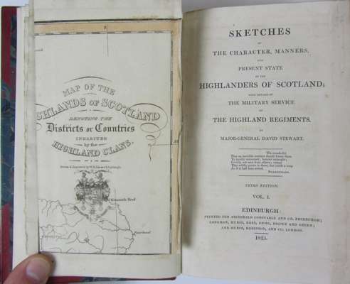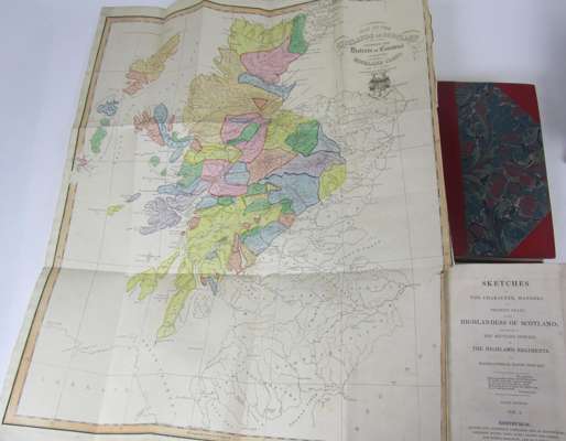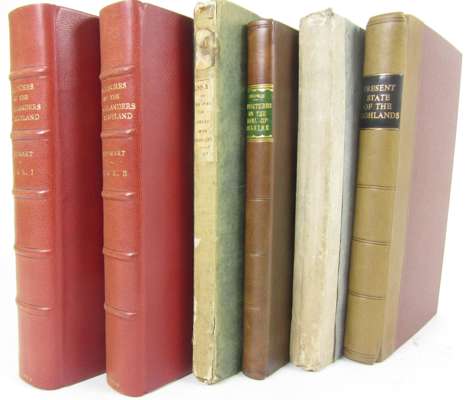 Observations on the present state of the Highlands of Scotland. London: Longman [&c.], 1805. First edition, 8vo, half-title, errata slip, calf-backed cloth; Brown, Robert Strictures and remarks on the Earl of Selkirk's Observations. Edinburgh, 1806. First edition, 8vo, title repaired and laid down, quarter morocco; [Highlands] Observations on objects interesting to the Highlands of Scotland. Edinburgh, 1814. Second edition, 8vo, original boards, uncut; Steward, David Sketches of the character, manners and present state of the Highlanders of Scotland. Edinburgh, 1825. Third edition, 2 volumes, 8vo, hand-coloured folding map, red half morocco by Ramage; Anderson, John Prize essay on the state and knowledge in the Highlands of Scotland. Edinburgh, 1827. 8vo, original cloth, worn (6)