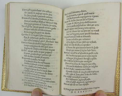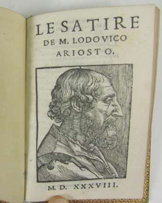 Le satire. Venice: Nicolo d'Aristotile detto Zoppino, 1538. 8vo, [64], large woodcut portrait on title, red morocco gilt, green morocco onlay to covers, g.e., bookplate, apparently from R.S. Turner sale [Sotheby's 1888]