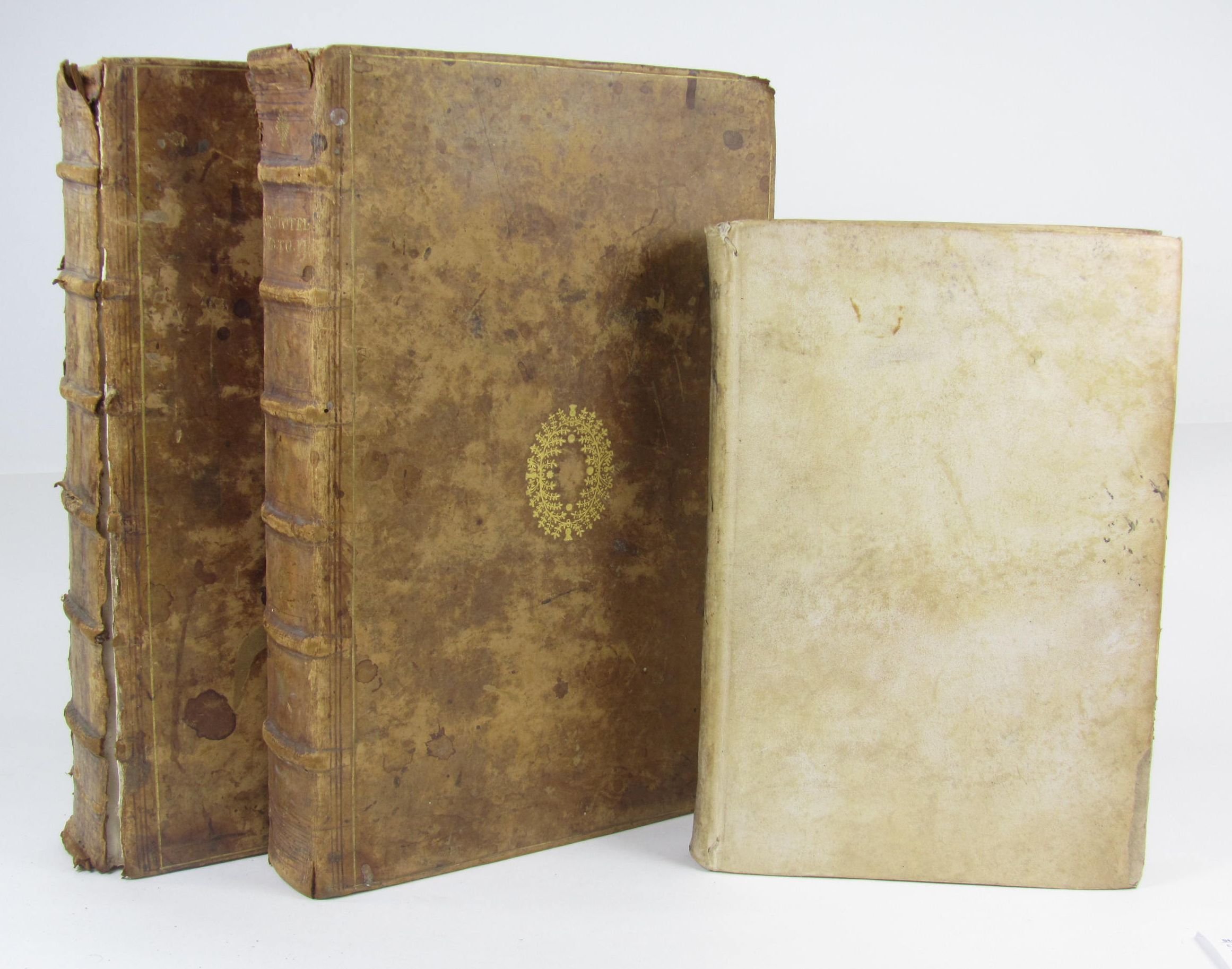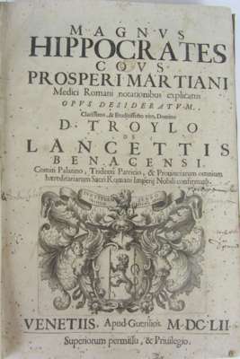 Opera (edited by Isaac Casaubon). Geneva: printed by Petrus de la Roviere, 1605 (i.e. 8th June 1606). 2 volumes, folio, titles printed in red and black, woodcut to title of volume 2, double column, text in Latin and Greek, contemporary calf gilt, occasional marginal dampstaining, worn, covers loose; Marziani, Prospero Magnus Hippocrates Cous...notationibus explicates. Venice: Guerigli, 1652. Folio, title with engraved vignette, contemporary vellum, lacking index, slight dampstaining; both works from the collection of Stanley Seeger (3)